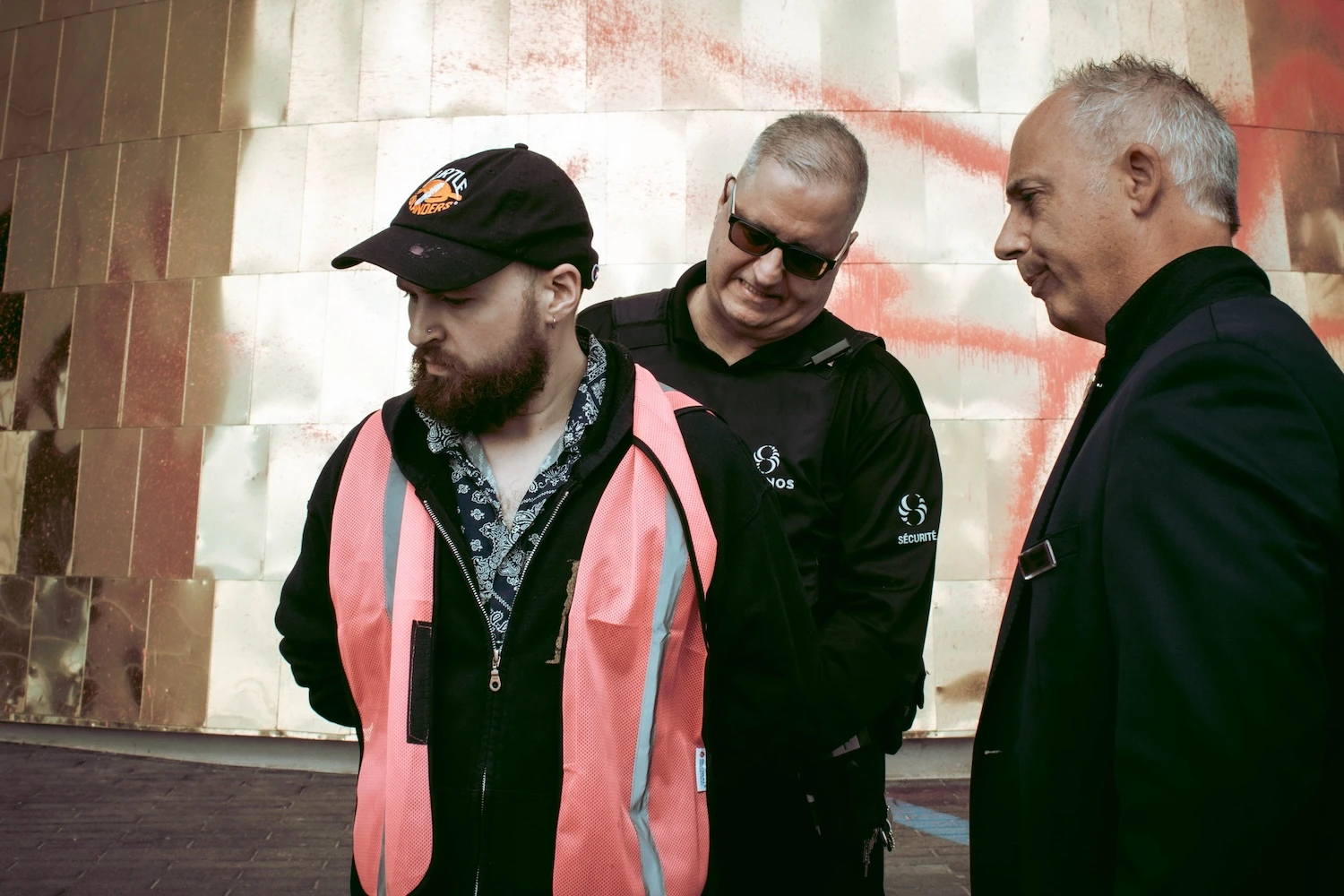 Une dizaine d’agents de sécurité surgissent aussitôt. Ils menottent les deux activistes et les amènent à l’écart – une arrestation citoyenne permise par l’article 494 du Code criminel. Cyrus et Eva ne résistent pas.
