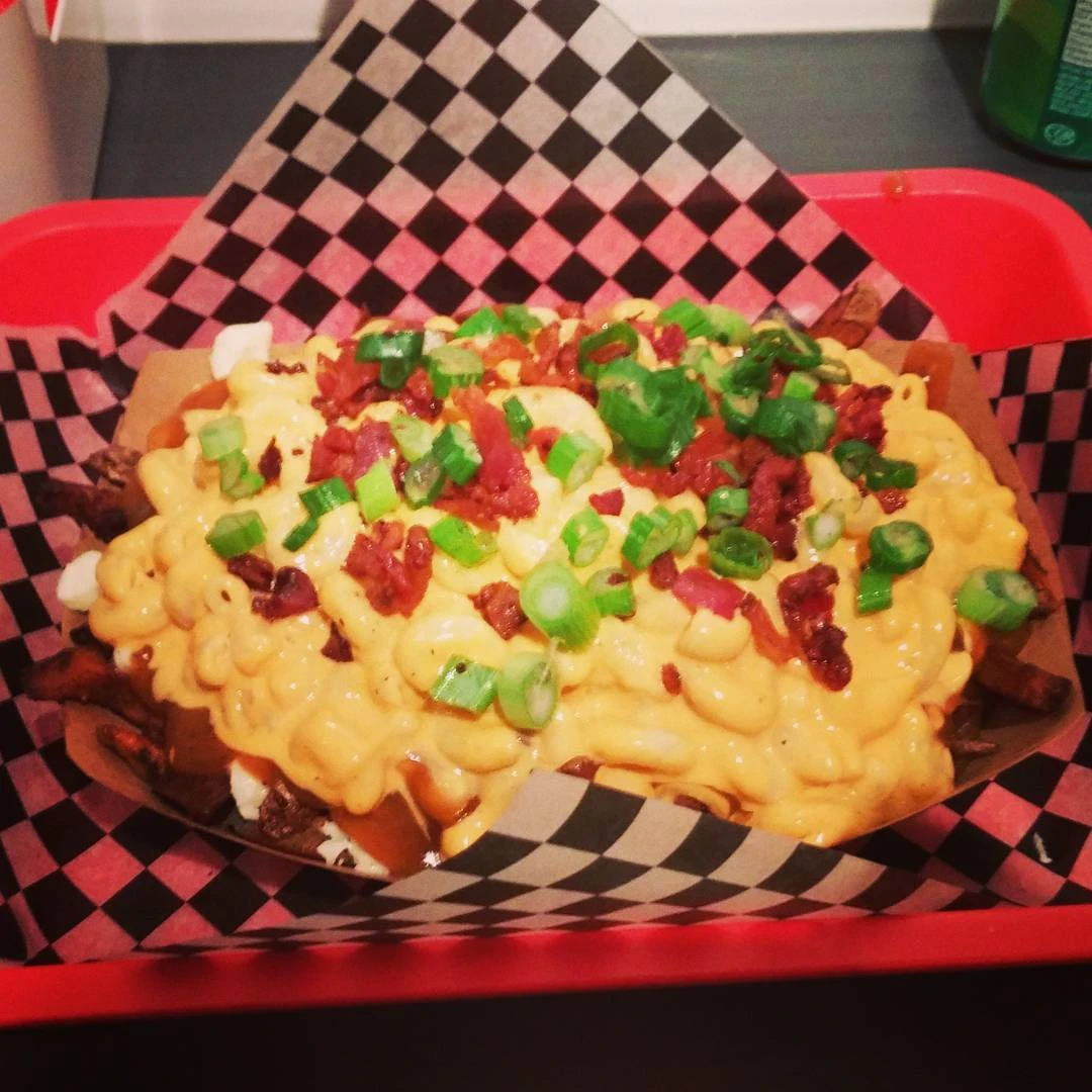 Tout de suite après, je me suis demandé qui était l’esti de malade qui avait pensé mettre du mac n’ cheese sur une poutine!? Ma réaction initiale fut de crier à l’hérésie, me disant qu’il y avait des limites à réinventer le plat national, surtout quand il s’agissait d’ajouter un autre féculent dans un plat quand même assez calorique en partant.