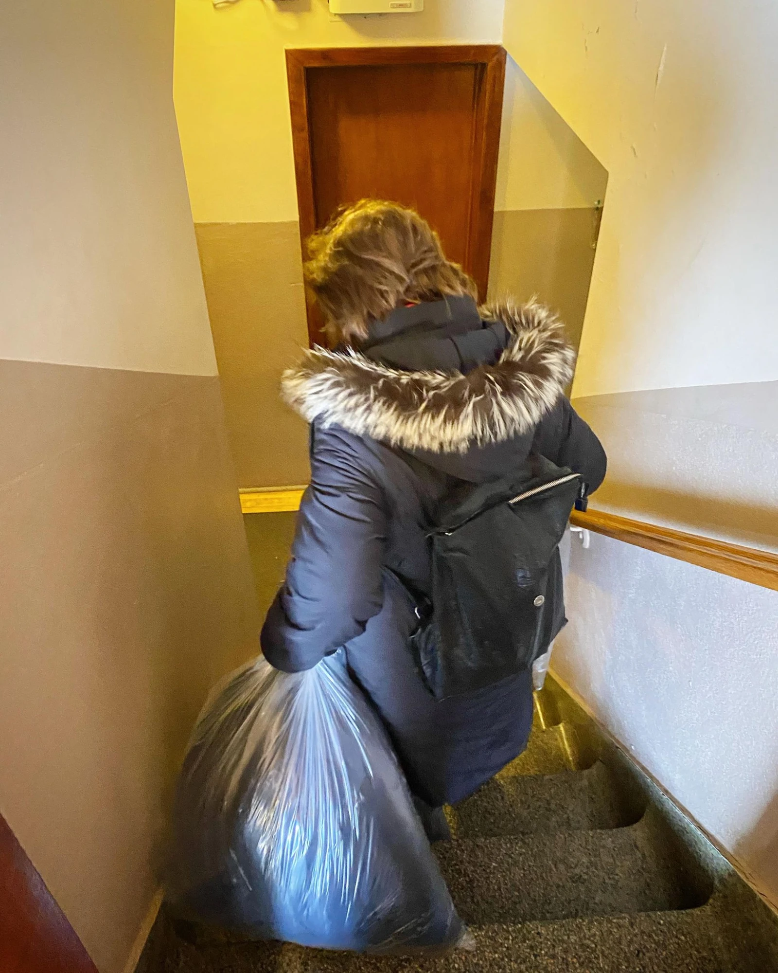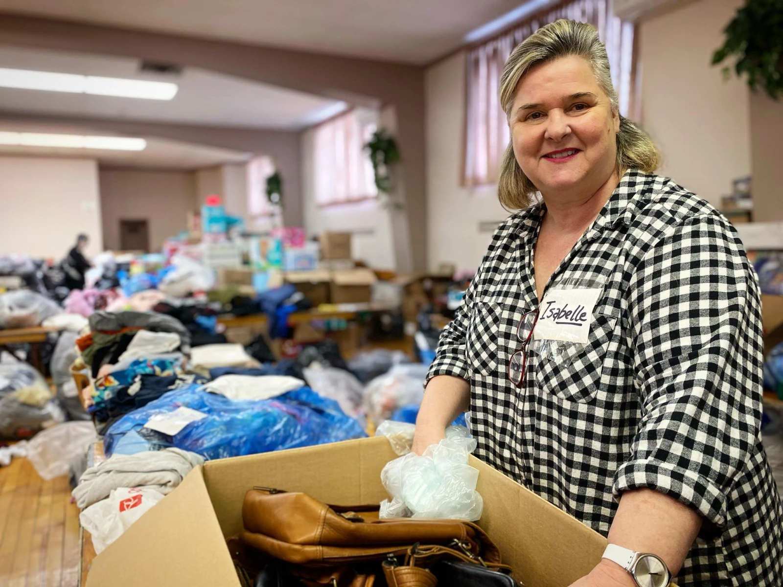Elle supervise les opérations dans le sous-sol de l’église, aux côtés de Wolodymir. « Je ne suis pas Ukrainienne, je suis Française, mais je suis surtout en colère. C’est cette colère que je suis venue canaliser ici », raconte Isabelle, en train de trier des vêtements pour femmes. « On a assez de linge maintenant, on a besoin de brosses à dents, dentifrices, savons etc. Le nécessaire pour recommencer leur vie ici. »