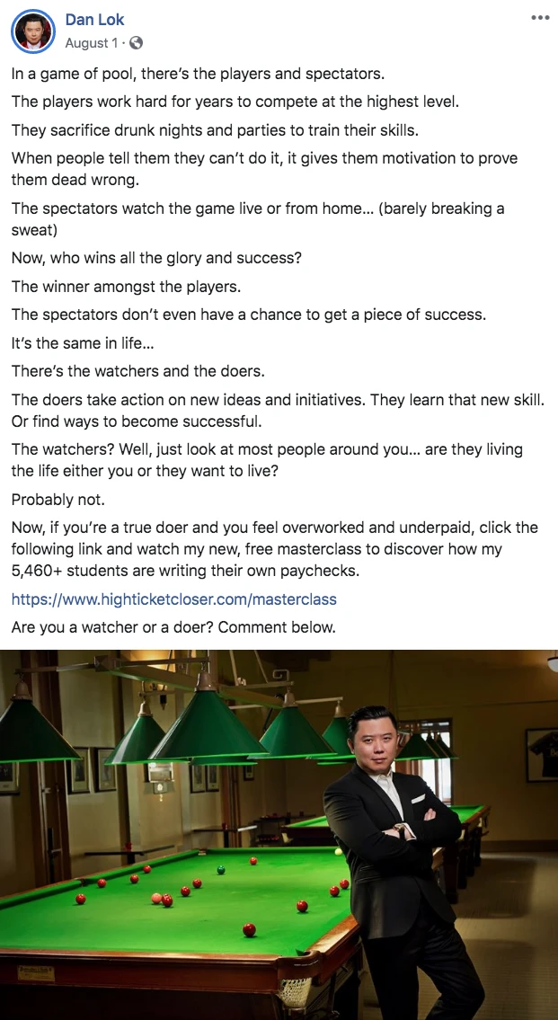 Dan Lok prétend qu’il a fait son premier million de dollars en tant que concepteur-rédacteur. C’est techniquement vrai, mais j’vous garantis que si vous vous trouvez une job de concepteur-rédacteur en agence de pub, ça ne vous rendra pas millionnaire. Du moins, pas à l’âge où Lok l’est devenu.