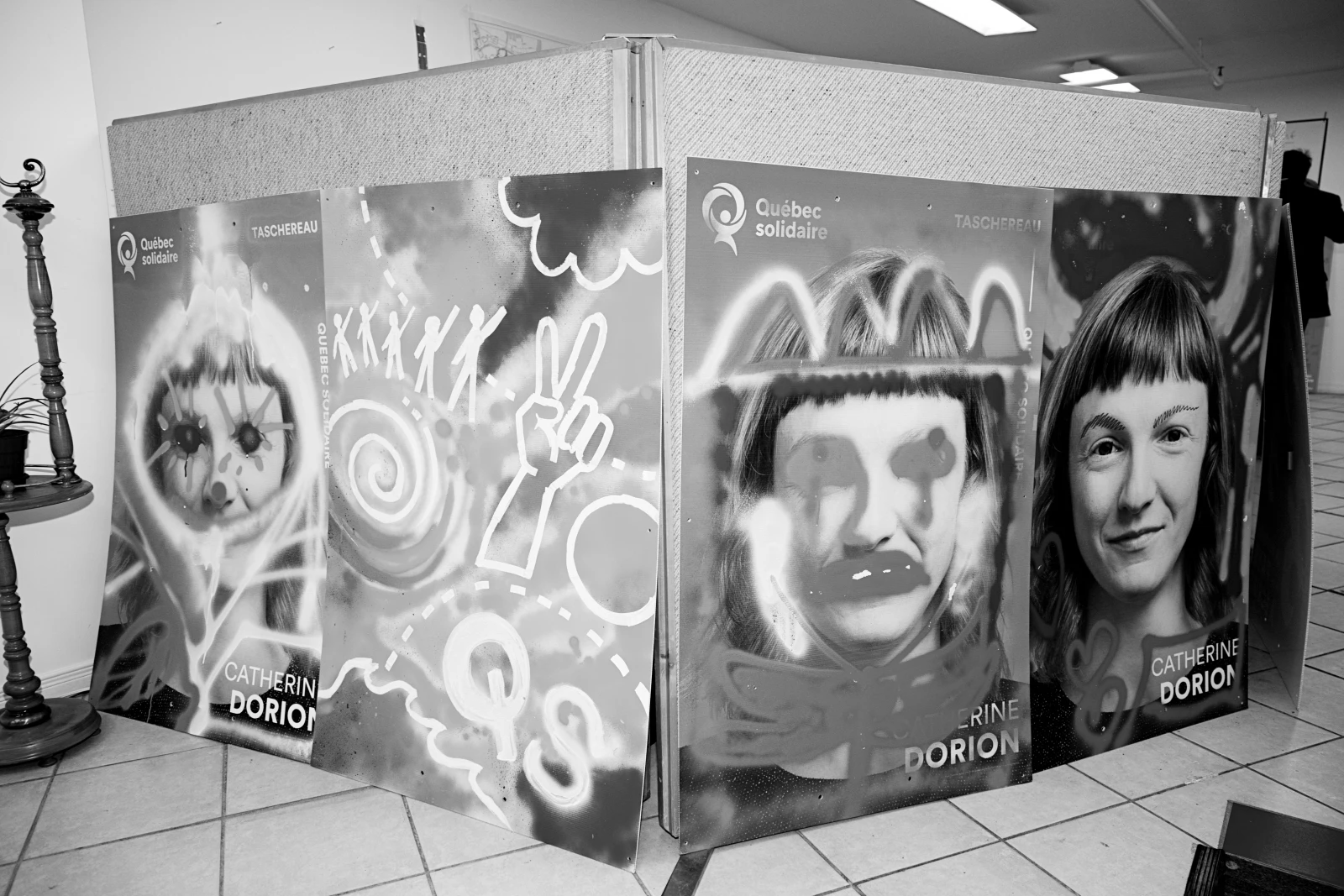 Il est 18 h 45. Direction le bureau de circonscription de Catherine Dorion. Le local est décoré de pancartes de la candidate volontairement « vandalisées ». Dorion en Bowie, Dorion en princesse, Dorion en clown. C’est irrévérencieux, c’est drôle, c’est léger, c’est différent. Ça fait du bien. Un petit pep-talk aux bénévoles et Manon et Gabriel prennent les téléphones et font ce qu’on appelle du pointage : parler aux électeurs pour voir s’ils vont voter du bon bord lundi prochain. Tranquillement on commence à lire la fatigue sur les visages des journalistes et des politiciens. Ma nuit au Cinéma l’Amour me rentre dans le corps moi aussi.