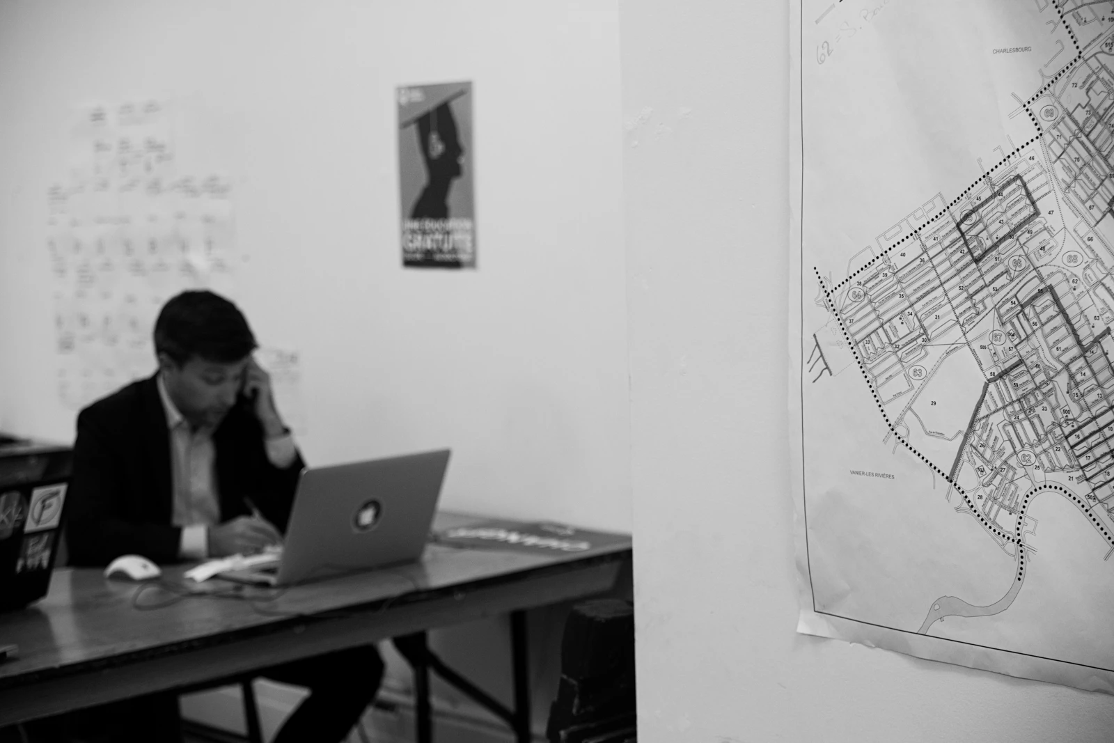 Dans un coin de la salle, une mère gère un appel tout en gardant un œil sur ses deux petites jumelles. Sur les murs, des cartes de la circonscription où on note les secteurs déjà visés par le porte-à-porte. Manon s’en va chez elle. Les autres vont à l’hôtel.
