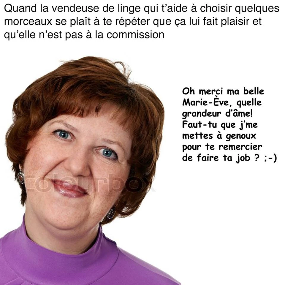 On a l’impression que ça fait longtemps qu’elle se prive et qu’elle fait passer le bonheur des autres avant elle. Ce qui semble être un trait commun de bien des madames boomers, si on en croit les photos passives agressives que plusieurs d’entre elles partagent sur FB.