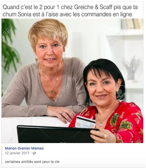 C’est au printemps 2017 que j’ai d’abord découvert les mèmes hilarants mettant en vedette une mystérieuse madame de stock photos. Issus de la page intitulée Manon Grenier Memes, les mèmes représentaient les impressions, les émotions et les anecdotes de la vie de Manon Grenier, une madame boomer de banlieue.