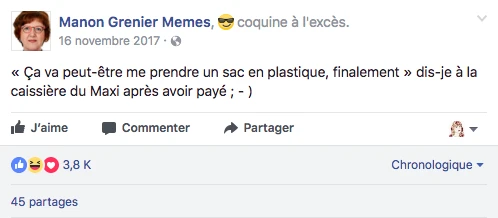 Au début de ta page (que tu as généré en janvier 2017), tu faisais le plus souvent des mèmes, c’est à dire des photos avec du texte dedans, accompagnées d’un statut qui présentait les mèmes.