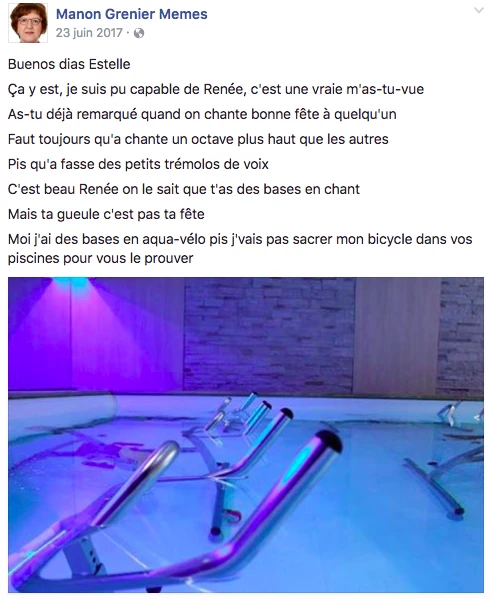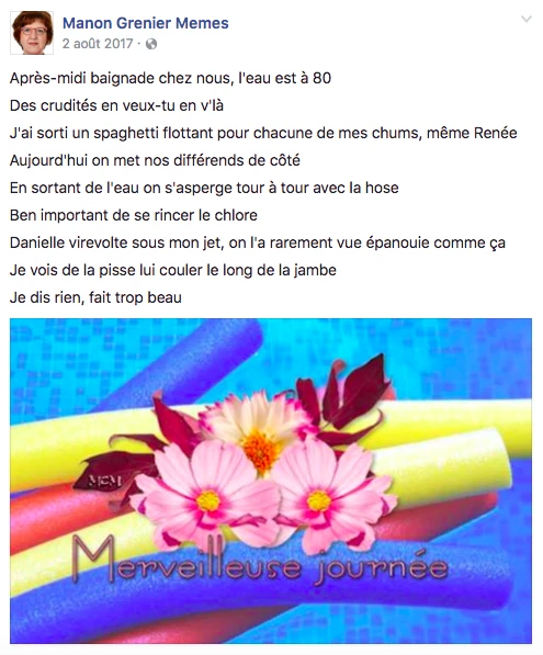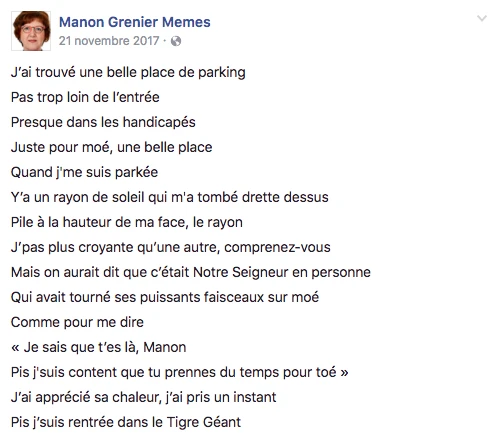Quand Manon est revenue sur Facebook, il a fallu qu’elle s’explique, qu’elle explique le malheur qui a motivé sa fugue. Ça a donné une série de posts un peu moins axés sur l’humour que d’habitude. Je sais pas si les gens s’attendent à ce que ce soit toujours drôle, mais j’aime ça que ce soit pas juste des gags, pis que les gens puissent lire des posts qui ont une atmosphère particulière, qui terminent sur quelque chose de surprenant.