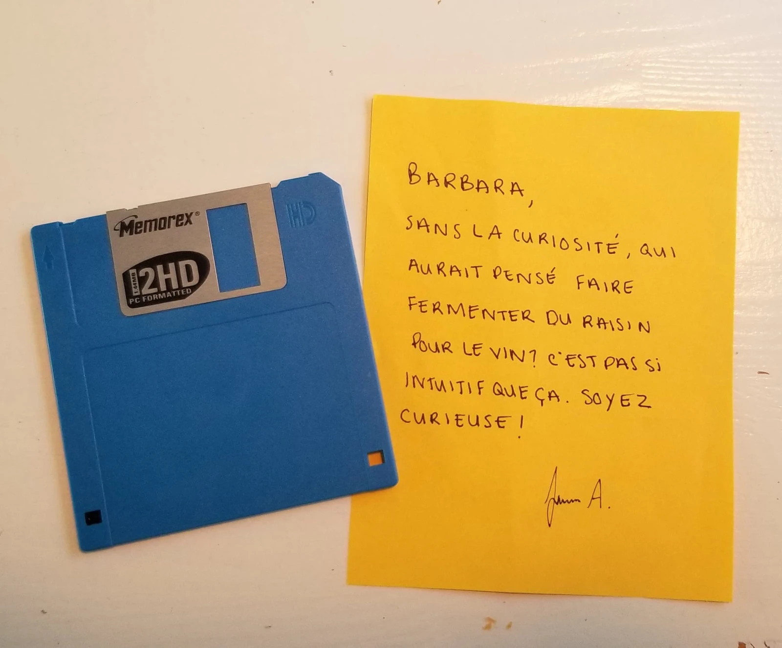 La semaine dernière au bureau, notre rédactrice en chef a reçu ce mystérieux message de la part de Laurence-Anne. Cherchant toute la semaine qui avait encore en 2019 du matériel pour lire une disquette, nous avons finalement réussi à trouver ce qui se cachait sur ce vieux morceau de plastique.