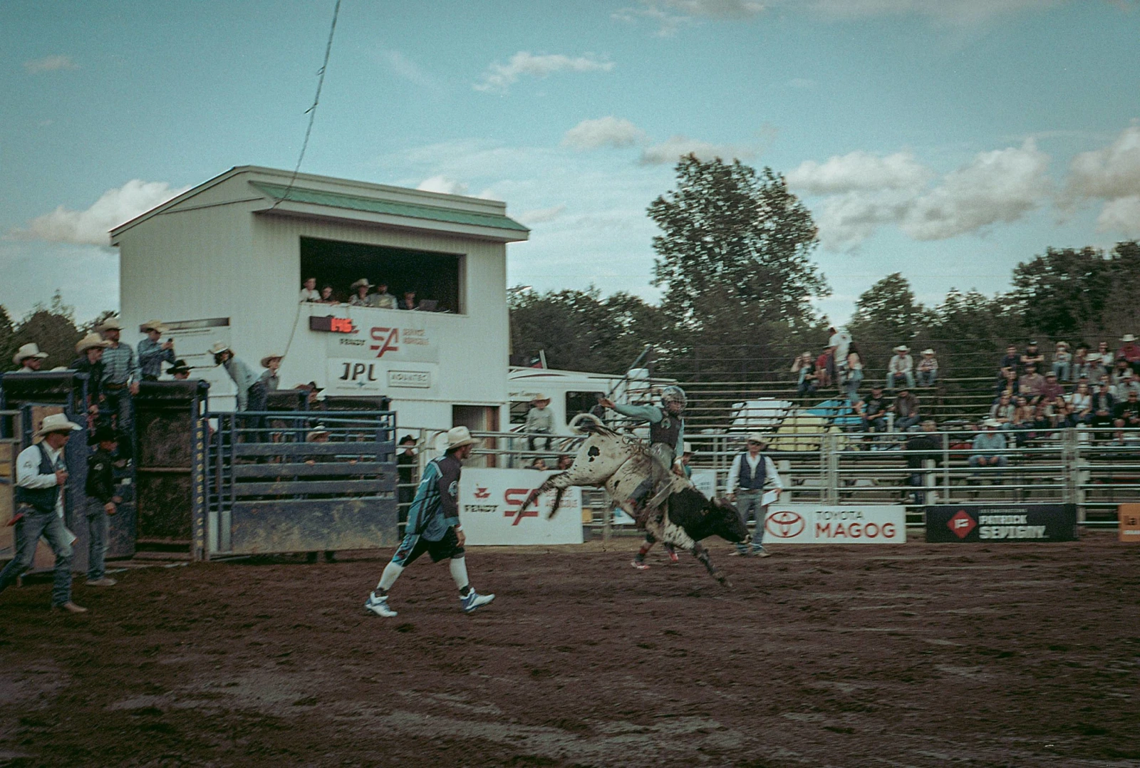 Je réussis à dénicher un accès au très sélect ring, où je m’entretiens avec Charles-Étienne Roy, seulement 25 ans et bull rider depuis maintenant six ans. Il me serre la main avec une droite tapée bien serrée. « T’sais, le rodéo, c’est cowboy. La moitié des gars sont tapés, les petites blessures font partie de la game. »