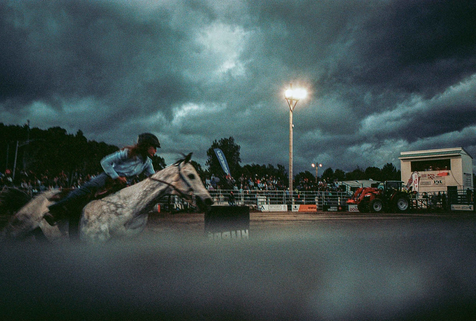 Les défis galopants se succèdent. La discipline du pick-up consiste à embarquer un cowboy le plus vite possible alors qu’il est lui aussi sur un cheval. Les chutes sont peu fréquentes, mais font partie de la réalité. Au cours de l’épreuve des courses de barils, une cavalière un peu trop agressive s’effondre avec son cheval dans un virage. La foule retient son souffle avant de célébrer leurs levées. « Une chance que ses pieds ne sont pas restés coincés dans l’étrier », commente une voisine d’estrade.