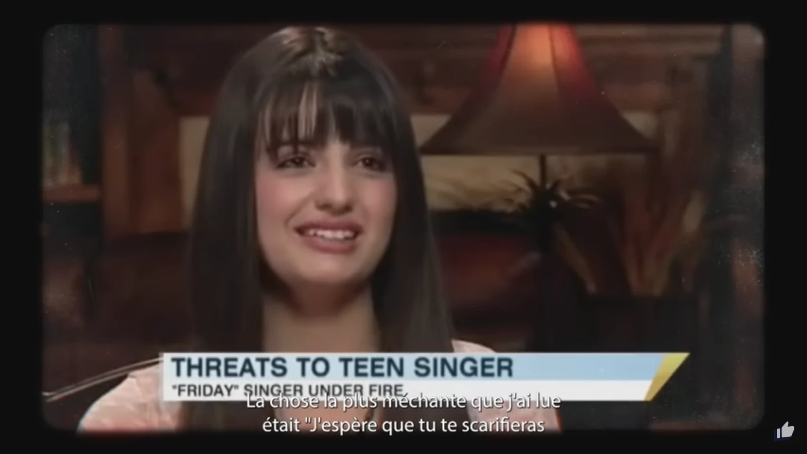 Une Californienne de 13 ans qui se dresse, cheveux au vent, dans le cabriolet de ses ami.es, et semble prête à en découdre avec son weekend. Une jeune fille qui voulait juste vivre son rêve et va bientôt devenir la risée des Internets. Avec ses 264 millions de vues et un ratio de 84 % de pouces rouges contre 16 % de pouces verts, le clip de Friday est l’une des vidéos les moins bien notées de la plateforme et la chanteuse en herbe va subir durant de nombreuses années un raz-de-marée de moqueries et un torrent de harcèlement.