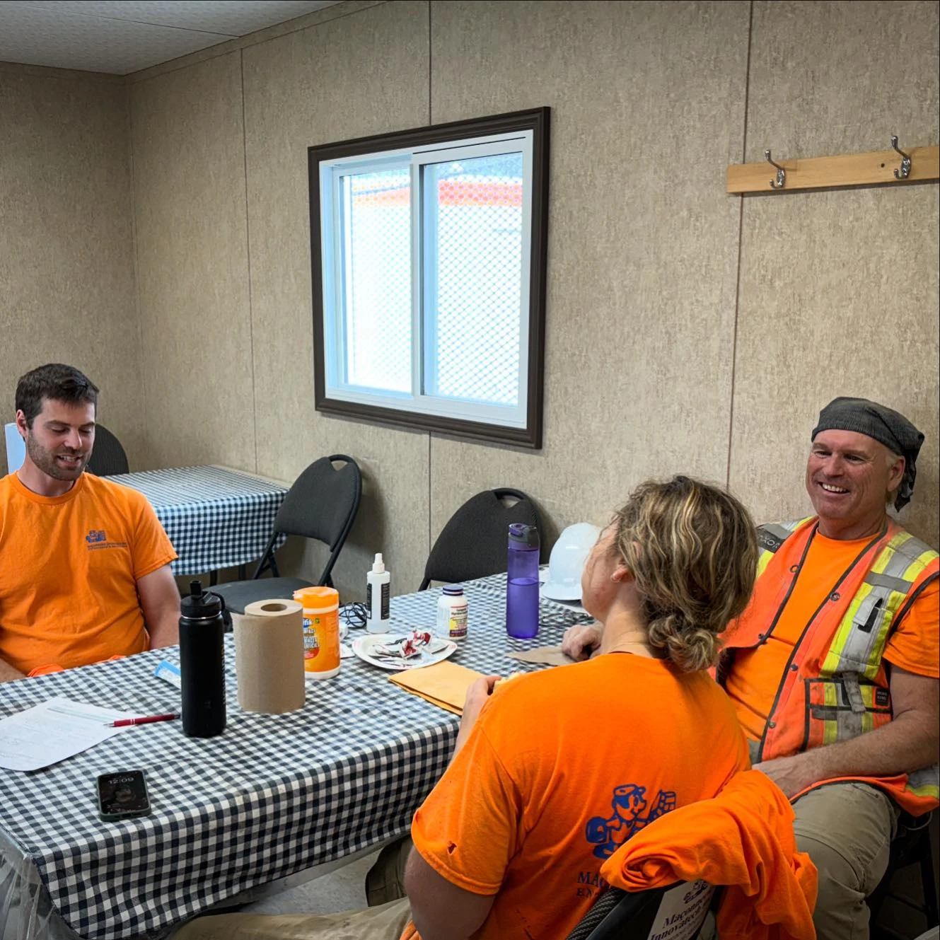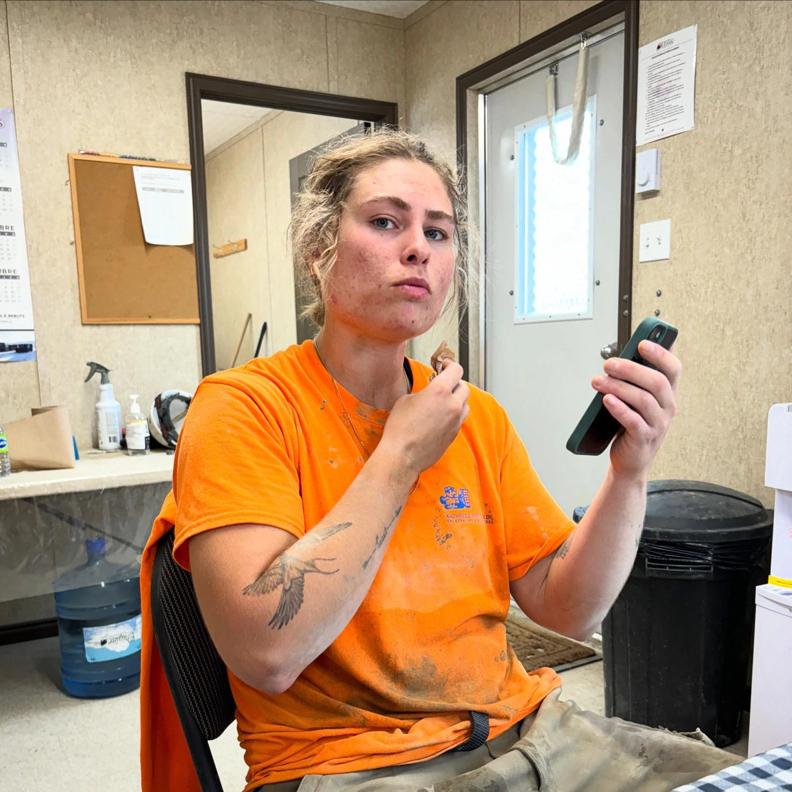 Midi, c’est l’heure du lunch. Les ouvriers se dirigent vers les roulottes de leur shop, alignées côte à côte. J’aperçois au loin une tignasse blonde qui dépasse d’un casque et reconnaît immédiatement le regard perçant de l’attaquante #28 de l’équipe de Montréal.
