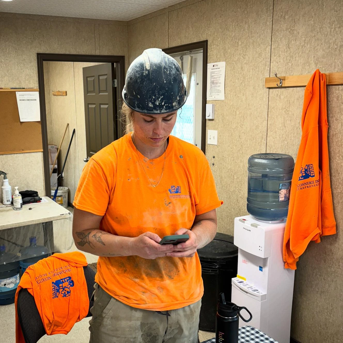 Au bout d’un dédale de couloirs et de poussière, on rejoint enfin son père Stéphane, et ses collègues Daniel et Denis, en train d’ériger un mur en blocs de béton. Je me dis que la coach Korie Cheverie capoterait sûrement de savoir que son attaquante travaille dans un milieu aussi hostile.