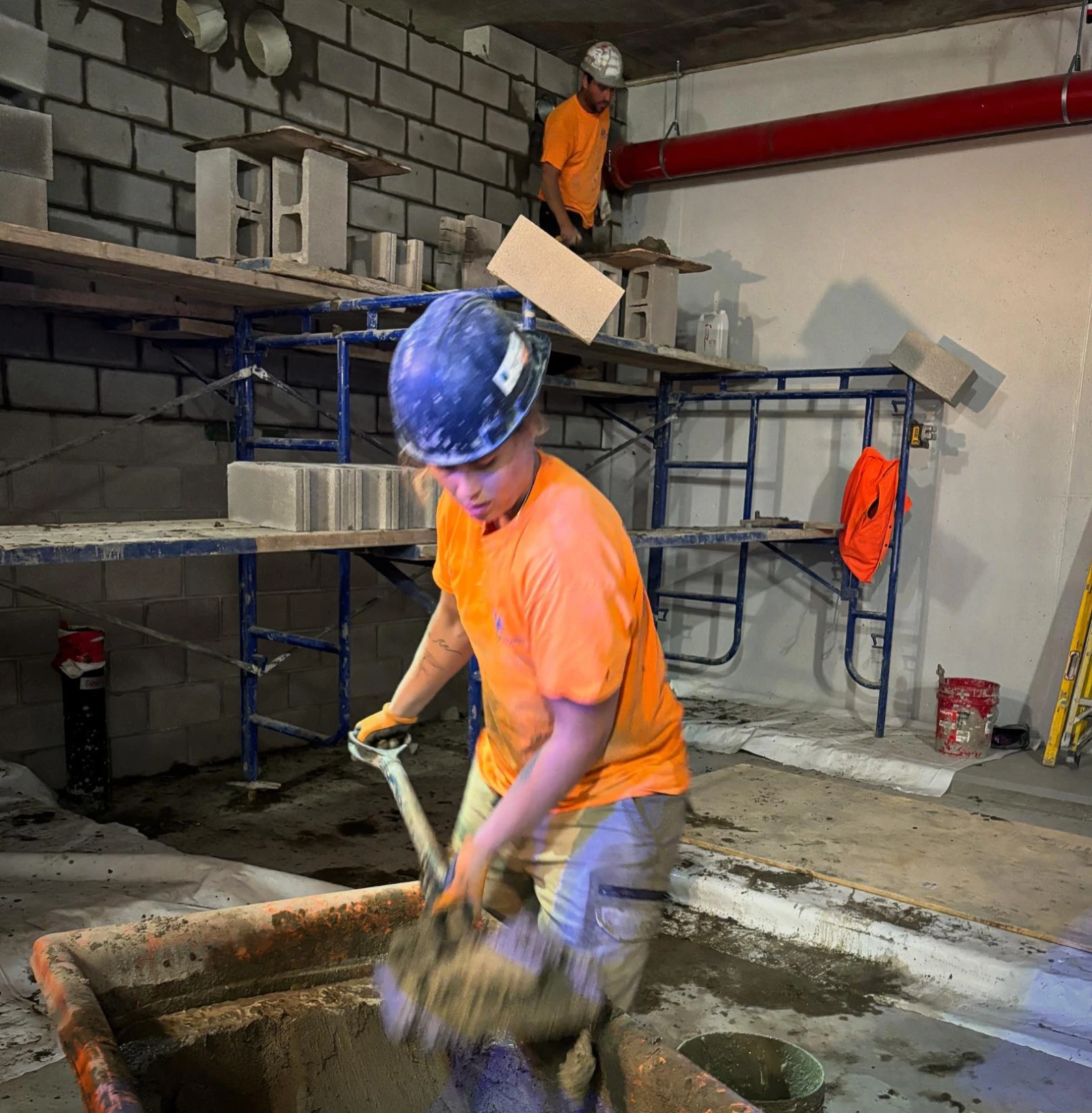Catherine ne perd pas de temps et commence à pelleter du mortier dans une chaudière, qu’elle transporte ensuite à ses camarades, non sans d’abord devoir grimper sur l’échafaud.