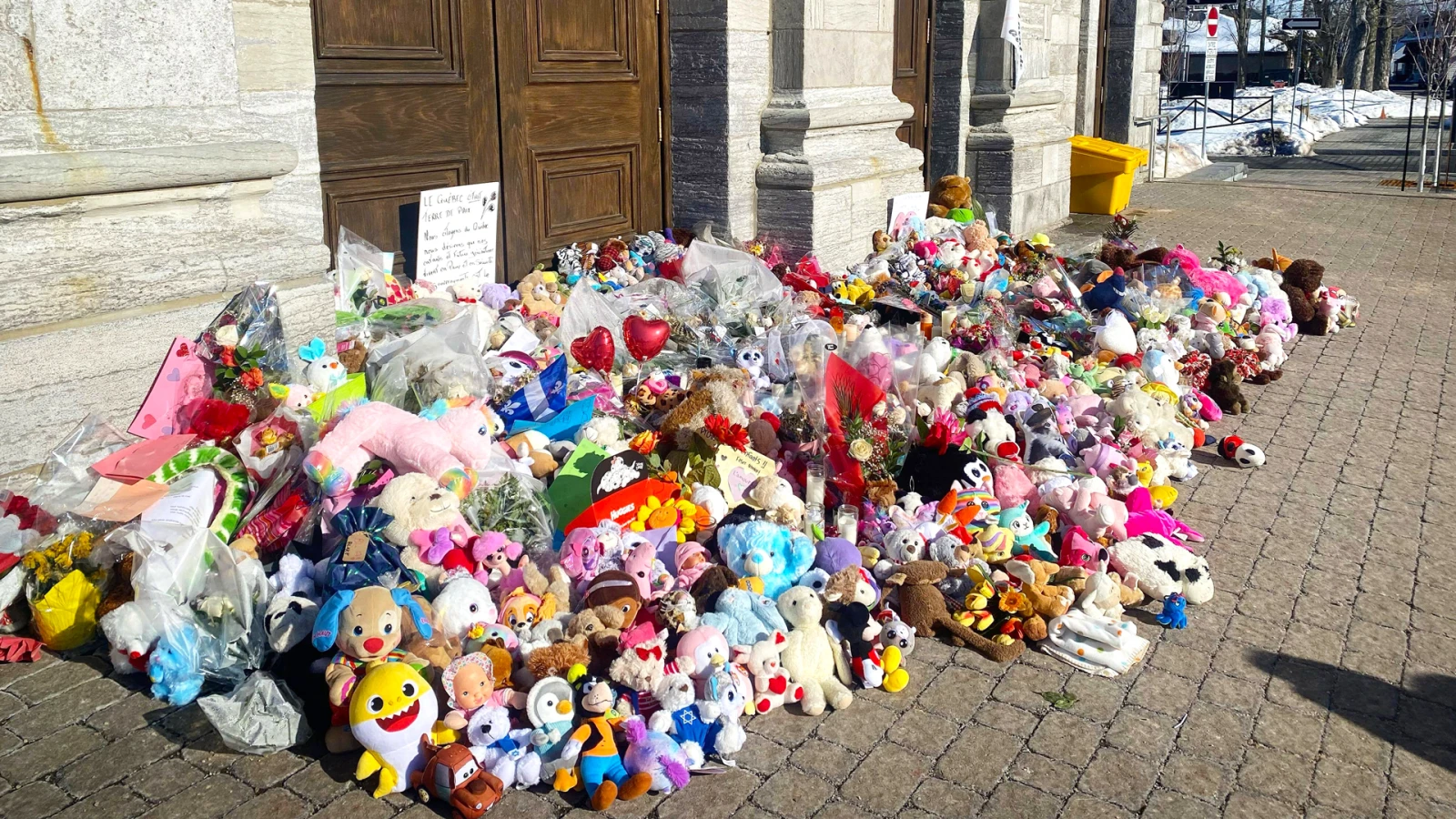 En retrait, Jeanne-d’Arc Cormier bifurque vers le parvis de l’église sur le chemin de la banque. Elle éclate spontanément en sanglots à la vue du monticule de toutous et de fleurs. « Je trouve ça dur. Je les connais pas [les victimes], mais je trouve ça très dur. J’ai deux petits-fils et deux arrière-petits-fils qui vont à la garderie. Je pense à eux. Il faut soigner les gens malades », plaide la dame de 88 ans, qui habite Saint-Rose depuis 40 ans.