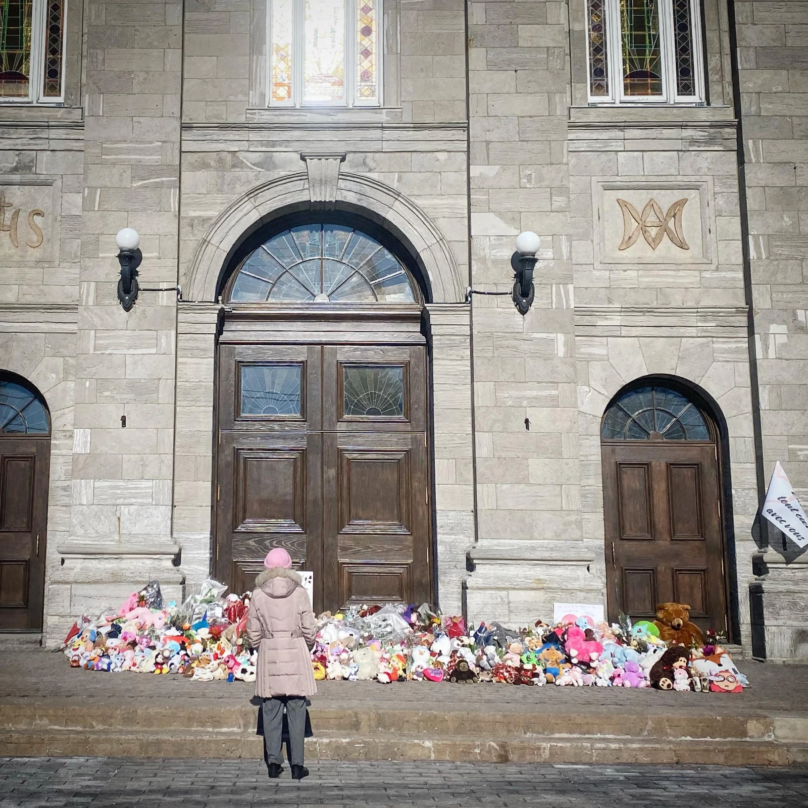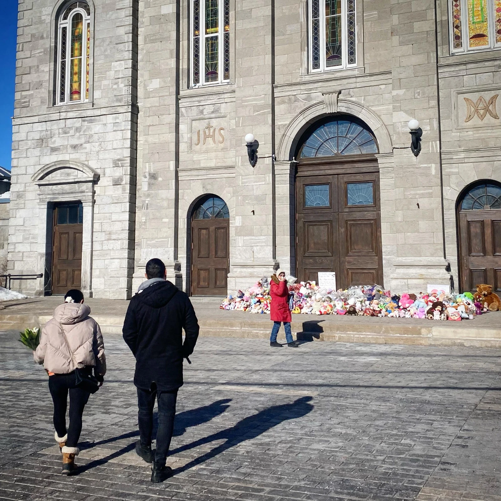 Chaque bouquet ou toutou déposé devant l’église prend la forme d’une jambette à l’horreur inconcevable de la tragédie.