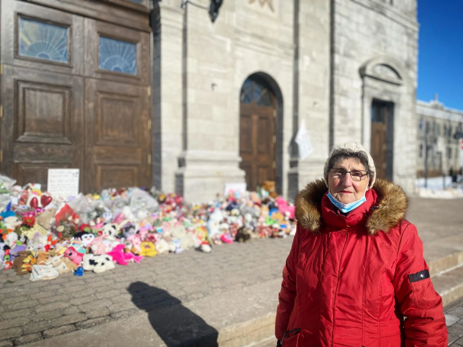 D’une voix étranglée sous son masque, Rose-Marie Bourbonnais se recueille devant l’église Sainte-Rose-de-Lima, où le parvis est jonché de fleurs, toutous et lampions à la mémoire des victimes de la garderie de Laval, située à quelques rues de là.