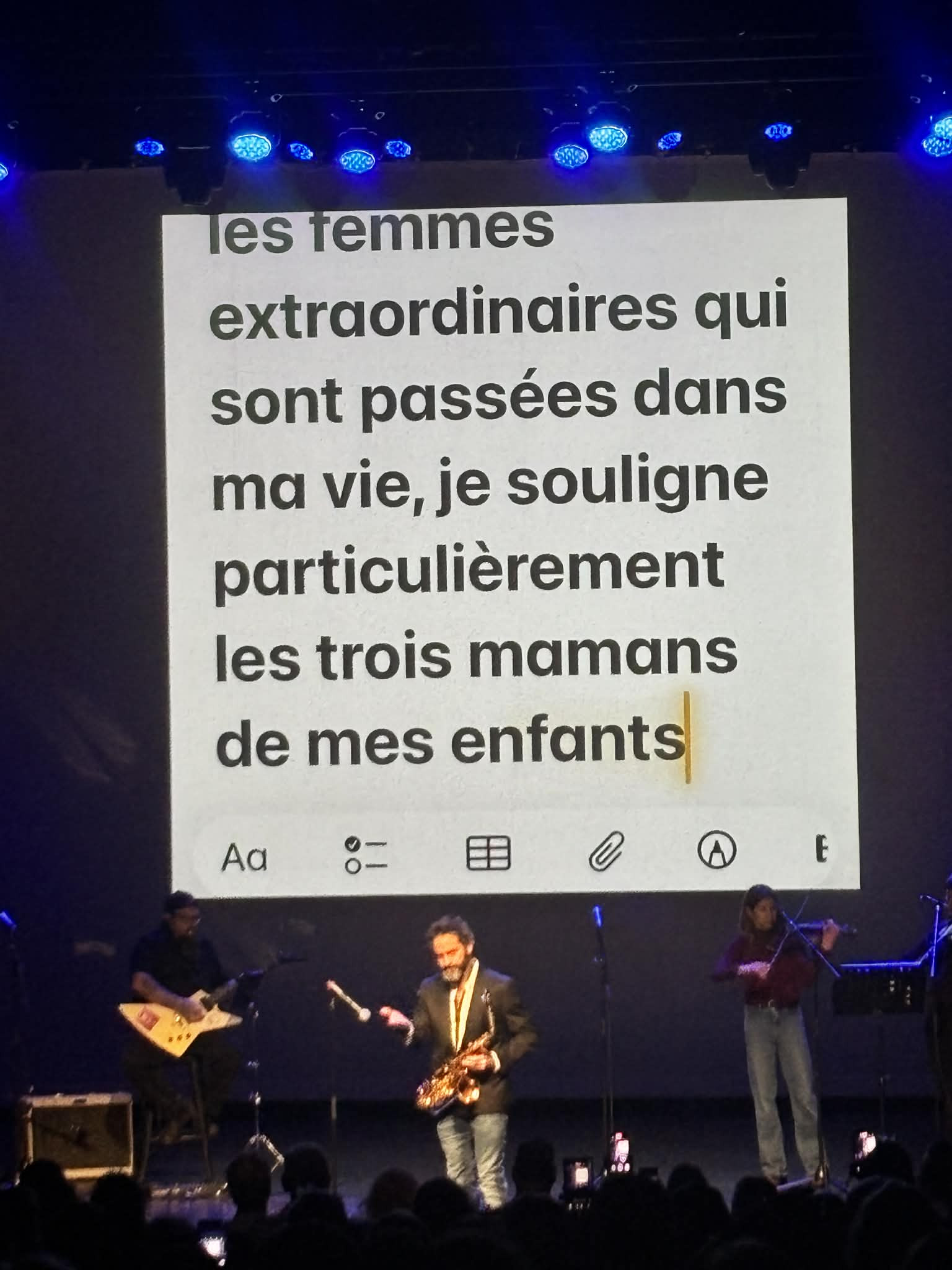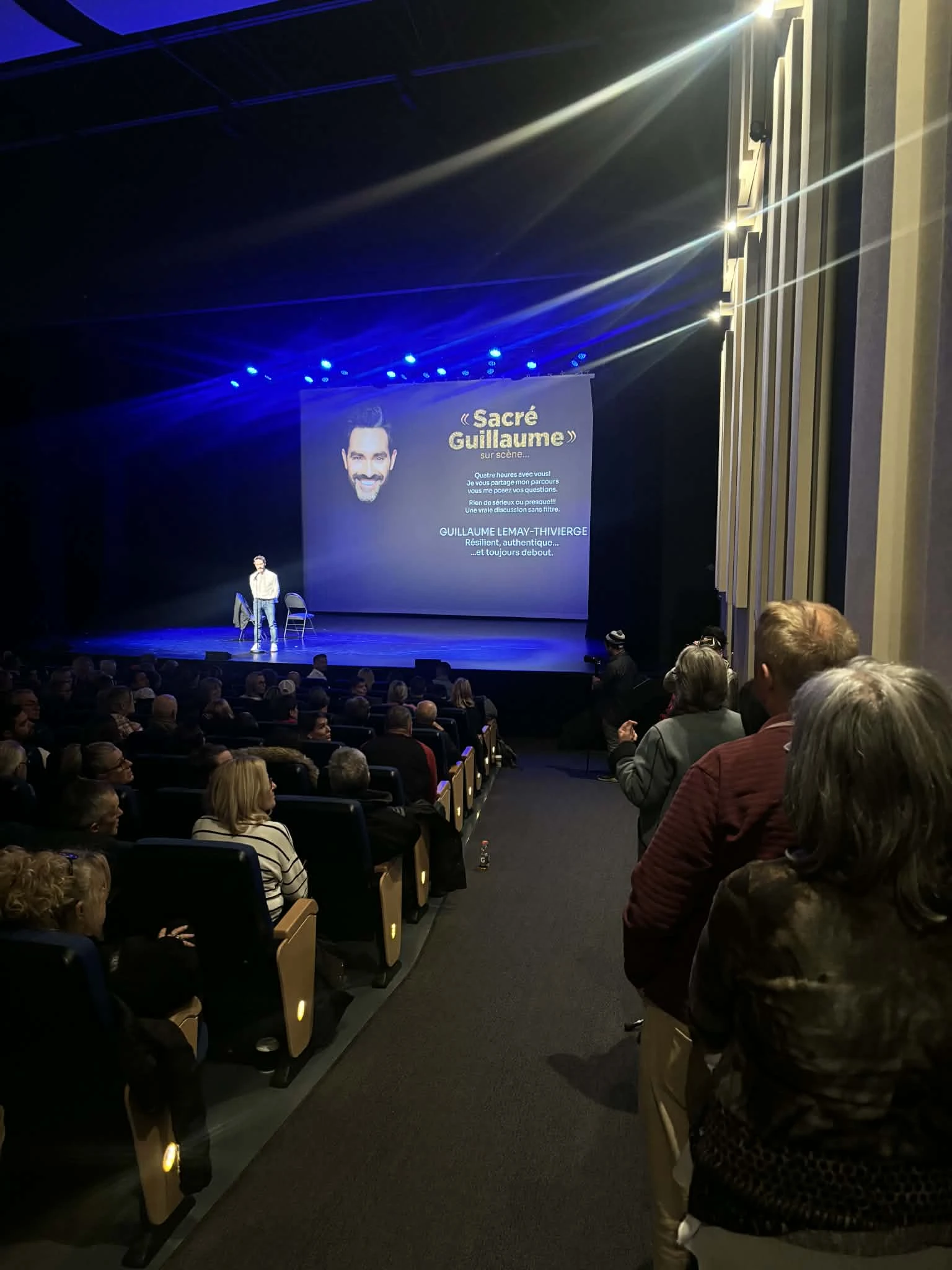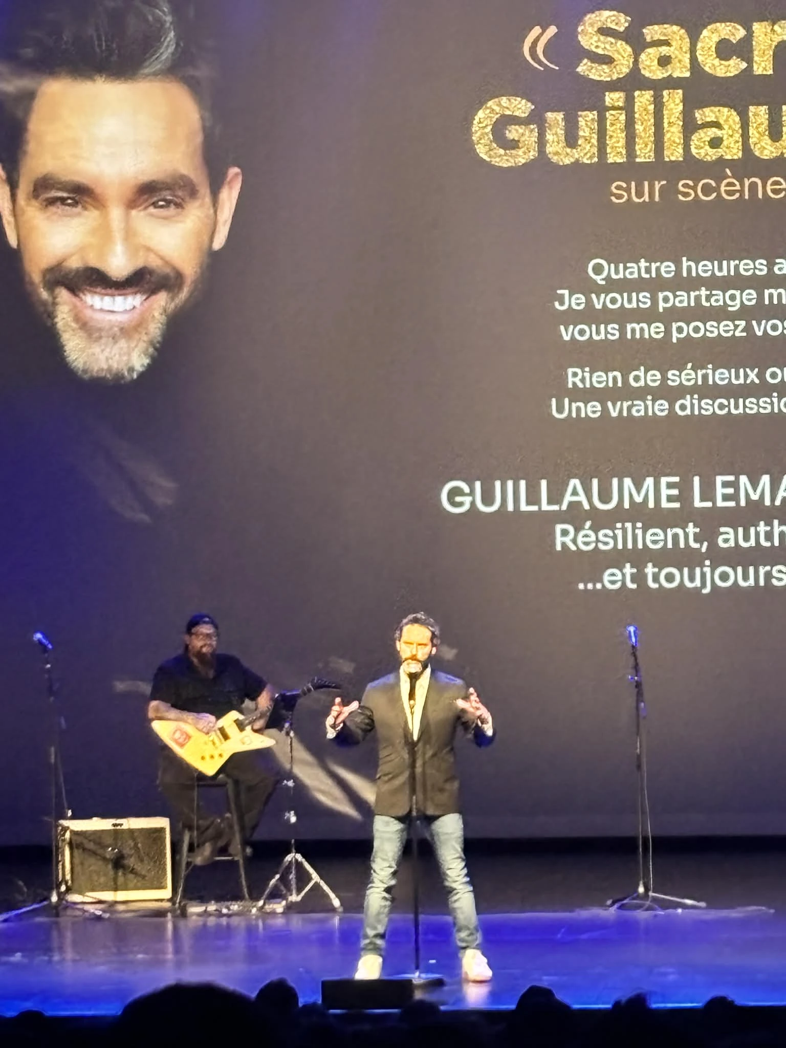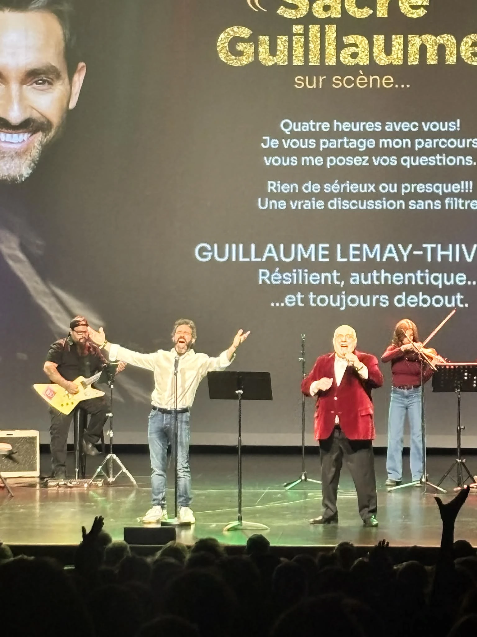 Gino, un ami du conférencier, s’avance au micro, pendant que d’autres musiciens vont s’installer derrière leurs instruments. Gino extirpe son cellulaire pour lire un texte remerciant les partenaires, sans qui « Guillaume aurait fait son show pareil, mais il serait juste arrivé plus serré ».