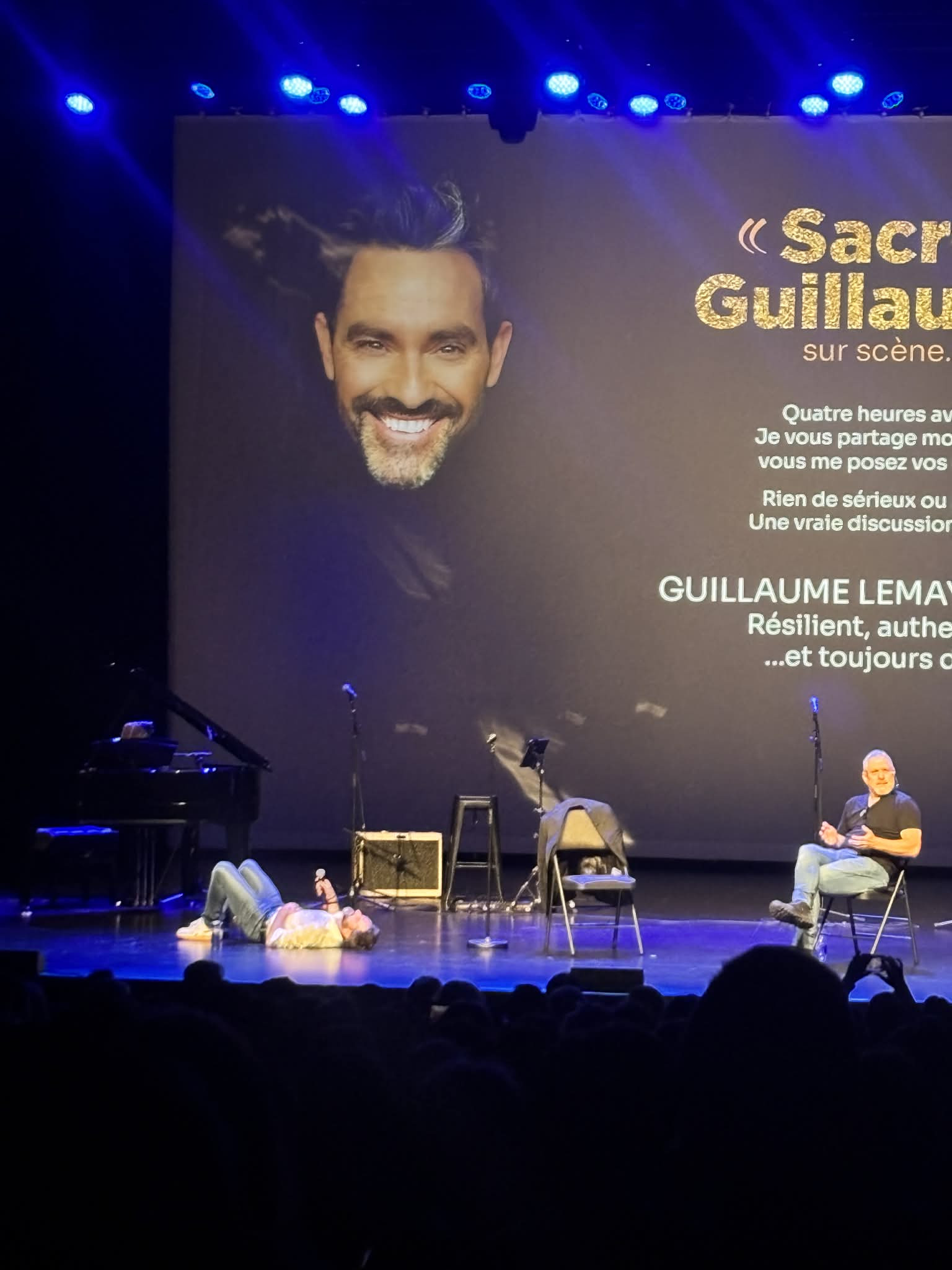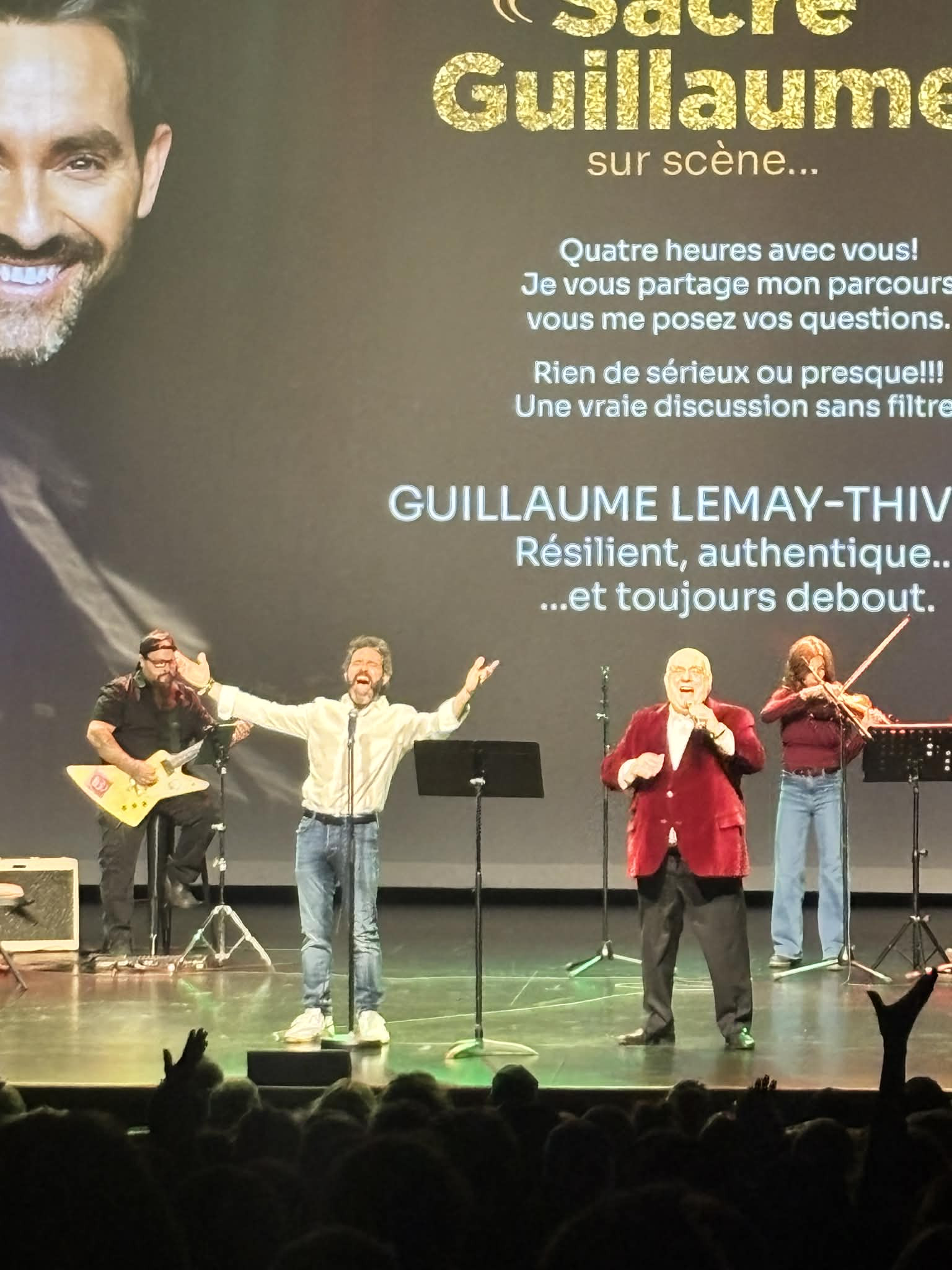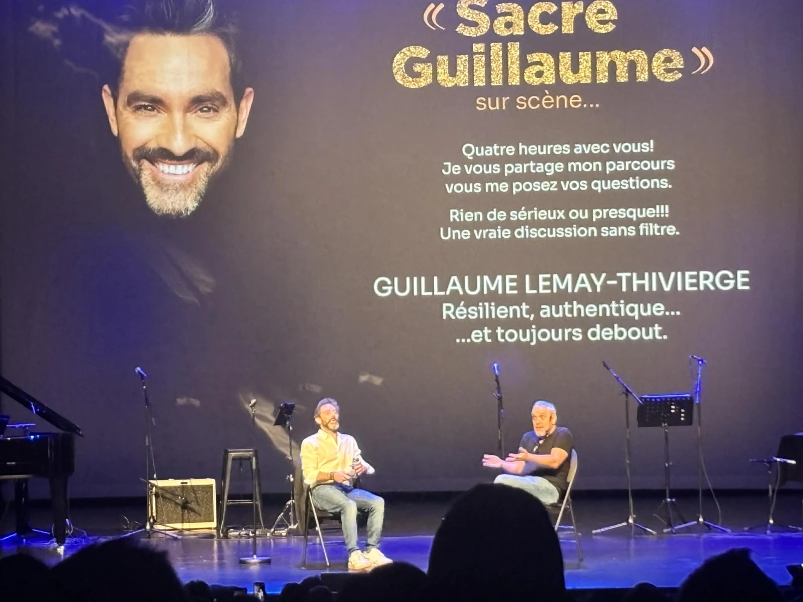 Plus de quatre heures d’un genre de conférence intitulée Sacré Guillaume se déroulant à Sainte-Thérèse, truffée d’anecdotes, de chansons, de blagues, de malaises, de projets farfelus et de confidences devant un public gagné d’avance. Une salle qui a dû – j’ai arrêté de compter – se lever au moins huit fois spontanément pour ovationner notre matou national.
