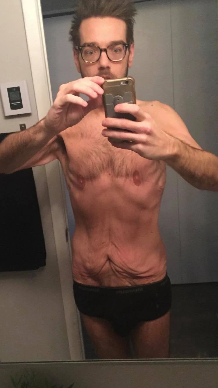 Jordan m’explique qu’à l’époque, il ne se permettait de vivre sa sexualité que dans un état altéré par les drogues. Il s’agissait du seul contexte dans lequel il arrivait à s’exposer. Là encore, la chirurgie bariatrique n’a pas été la solution magique espérée. C’est que depuis l’intervention, et surtout depuis la rémission de son trouble alimentaire, il a perdu 185 lbs. Aujourd’hui, sa peau n’a plus la fermeté et l’élasticité à laquelle on est habitué. Sous les vêtements de Jordan se trouve un corps différent.
