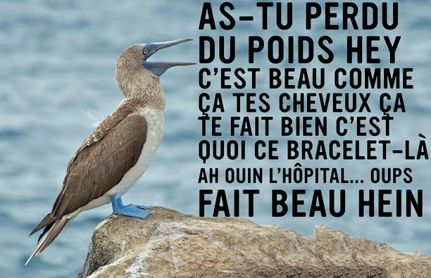 «Eille, j’avais pas remarqué encore, t’as une pupille plus grosse que l’autre! C’est cool, ça te donne un p’tit air de David Bowie. Y’est tellement beau. J’aime ça le monde spécial.»