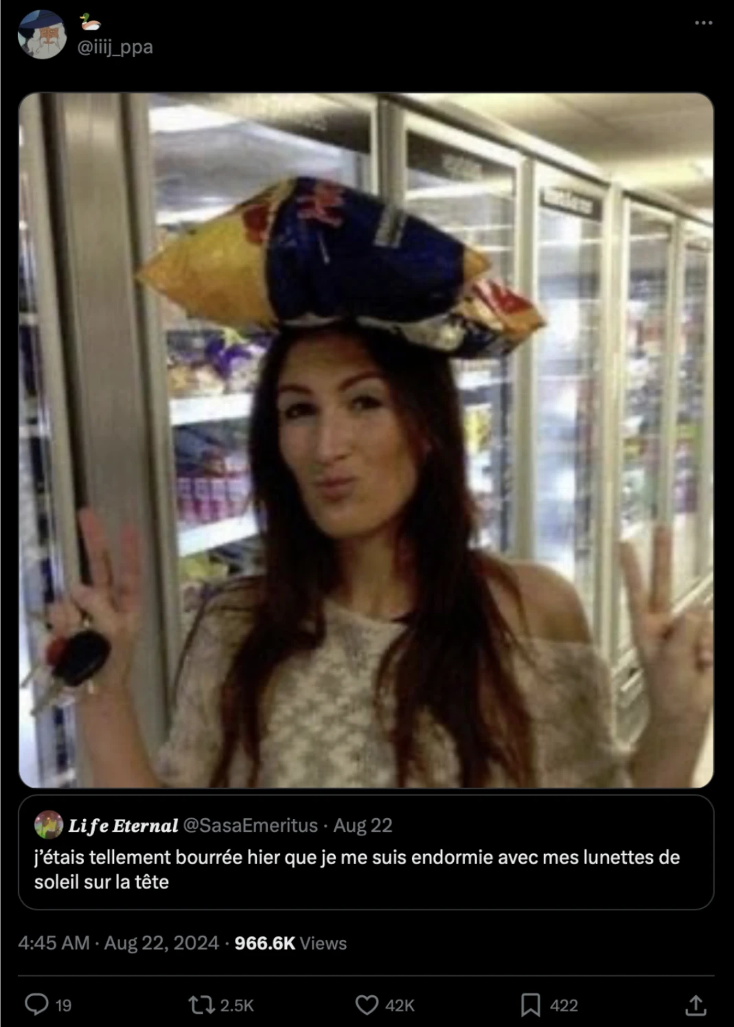 À première vue, rien n’a de sens, ici : un internaute publie la photo d’une femme avec un sac de frites congelées sur la tête en réponse à une utilisatrice qui explique s’être endormie avec ses lunettes de soleil, tant elle était ivre.