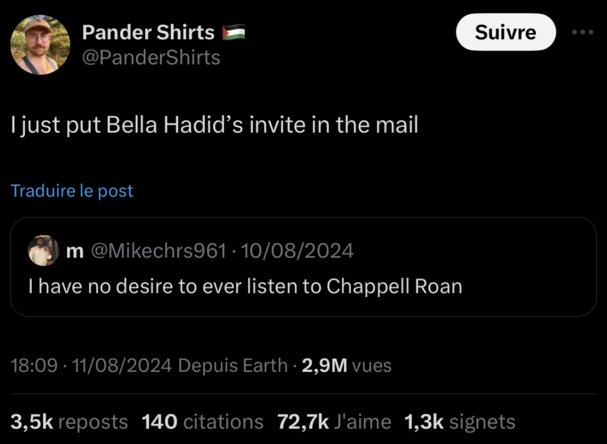 Ainsi, lorsqu’un utilisateur X annoncera ne jamais vouloir écouter ne serait-ce qu’un seul titre de la chanteuse Chappell Roan, un autre le préviendra qu’il vient tout juste d’envoyer par courrier « l’invitation de Bella Hadid ».