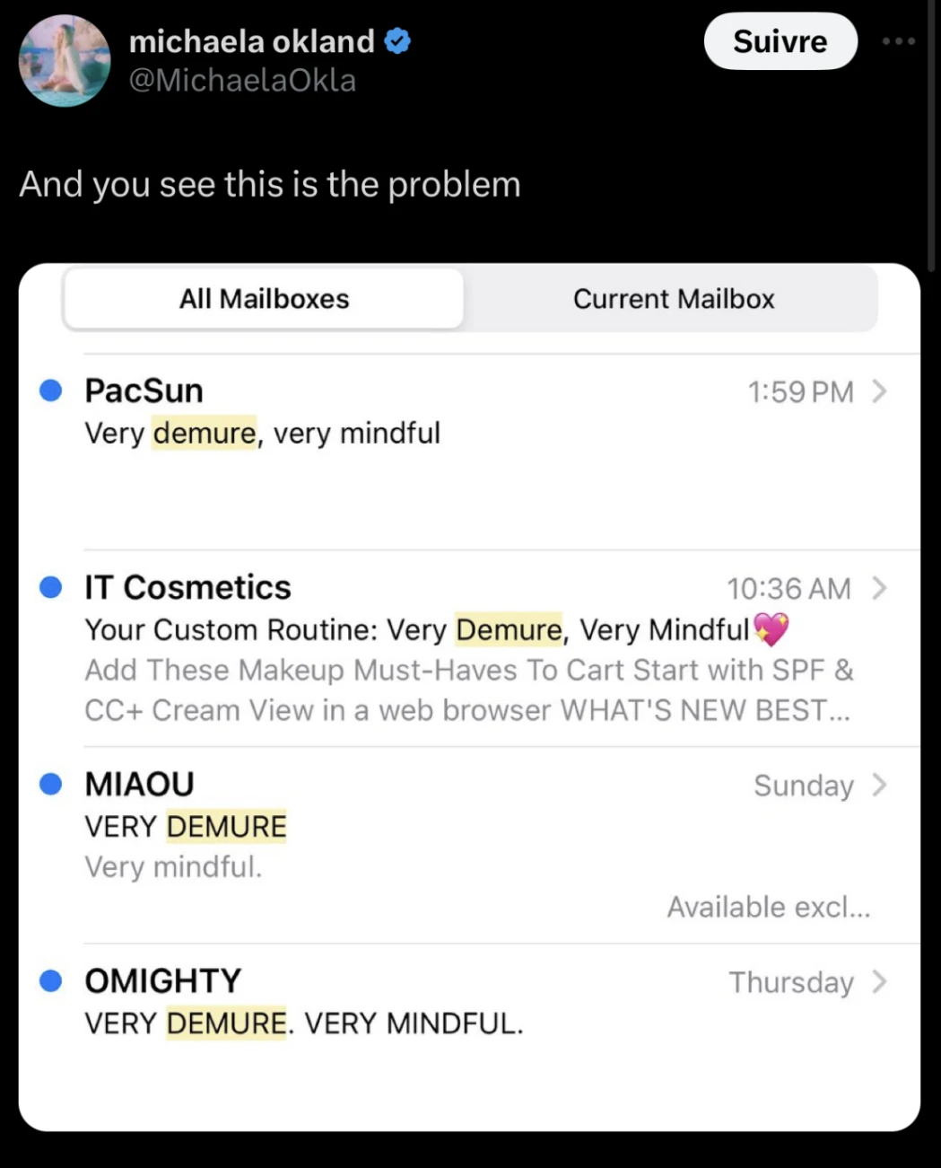 Sauf qu’il y a encore une expression anglaise nouvelle, depuis quelques jours : « very demure, very mindful », soit « très élégant, très consciencieux ».