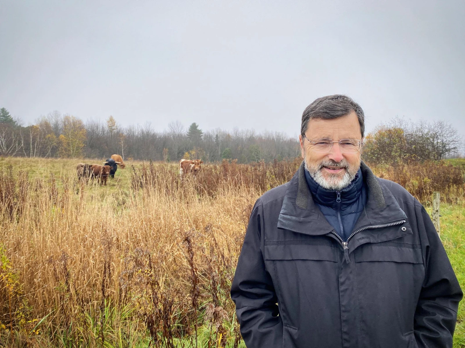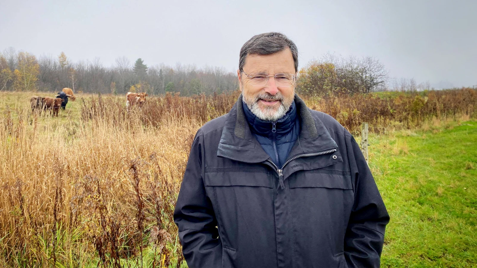 Denis me tend la main entre deux bouchées de toast généreusement enduites de fromage Boivin à tartiner, un must. « Ah, c’est dommage que ça soit brumeux, sinon tu verrais l’abbaye (Saint-Benoît-du-Lac), le lac (Memphrémagog) et mes vaches dans le champs, là-bas », se désole Denis Lévesque, en pointant du doigt l’horizon noyé dans le brouillard.