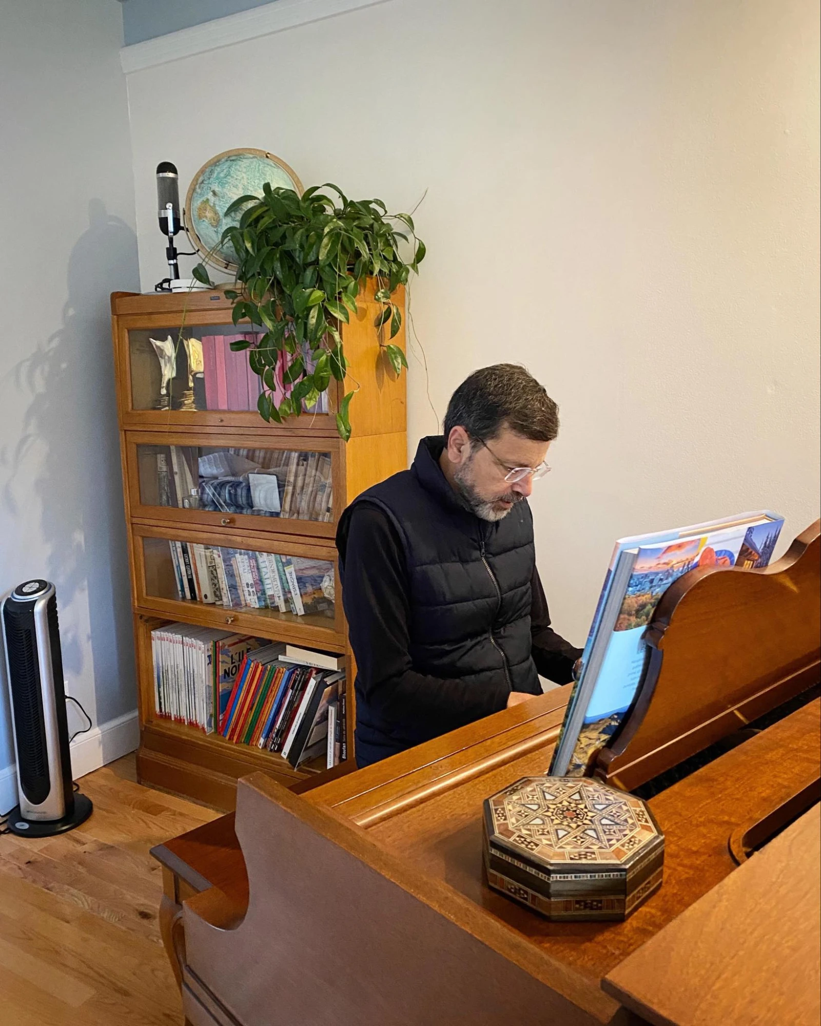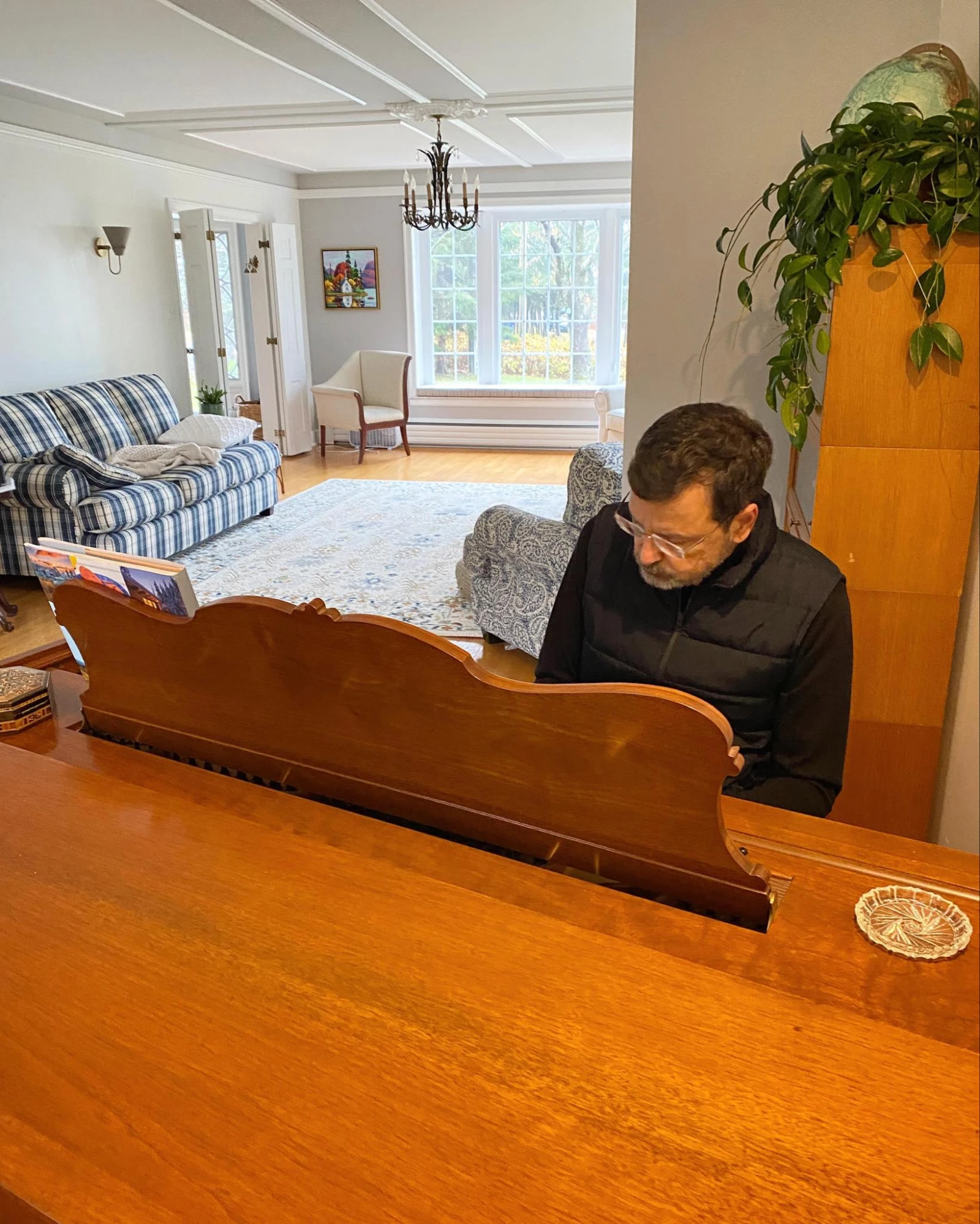 Si son arthrite l’empêche désormais de gratter la guitare, il affectionne son piano, sur lequel il me montre brièvement son savoir-faire.