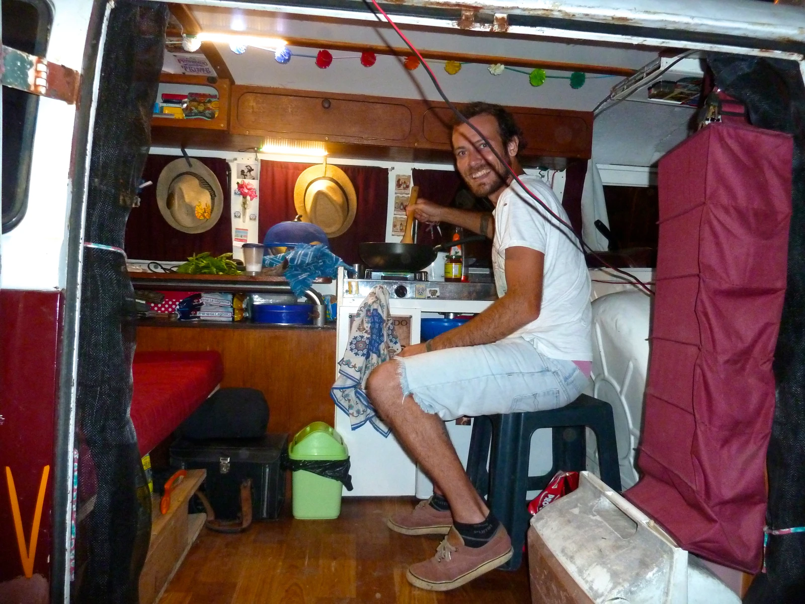 Dans ma maison sur roues, je n’ai pas de micro-ondes, ni de frigo électrique, ou de télé. Ma chambre, c’est aussi mon salon, ma cuisine, ma toilette. Oui, c’est petit, mais c’est parfait. Ça me permet d’avoir la cour la plus grande: le monde. Puis, au lieu de vivre à 120 km/h, je vais à 75, parce que de toute façon, c’est la vitesse maximum de notre van, la flamboyante Shila.