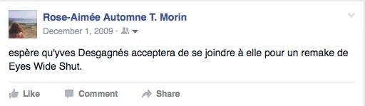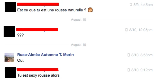 Et bon, on s’entend, je ne suis pas une vedette. Je ne suis personne. Je n’ose pas imaginer ce que reçoivent les femmes célèbres. Genre Marilou et Élise Guilbault. Je me demande aussi de quoi a l’air l’inbox “Autre” des hommes. Est-ce qu’Éric Bruneau reçoit beaucoup de messages concernant sa transexualité, lui aussi ? Est-ce que Cédric Pépin (le seul roux de Virginie) doit constamment valider la couleur de son poil à des internautes? Ce ne sont pas des questions rhétoriques : je-veux-des-réponses.