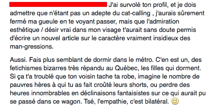 Vraiment, on trouve de tout. Il y a aussi un homme qui m’a reproché de manquer de respect pour mon mari en parlant trop de sexe, alors qu’un autre m’a envoyé une version modifiée de ma photo de profil où il avait transformé mes bas-collants en bas sexy…