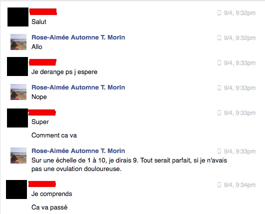 Pour en revenir aux étranges messages que je reçois, je me dis qu’il ne s’agit peut-être que d’une approche particulièrement audacieuse ou un peu malhabile de la part de personnes très motivées. Et ce n’est pas parce que Facebook te considère louche au point de te crisser dans un trou noir virtuel que tu ne mérites pas d’attention. C’est pourquoi j’entame un dialogue avec ceux qui m’écrivent. Ça vire généralement bien. On arrive à un terrain d’entente. Il y a du respect. La lumière est partout, même dans les plus sombres racoins de nos vies sociales. L’humain est beau, prenons la main qu’il nous tend.