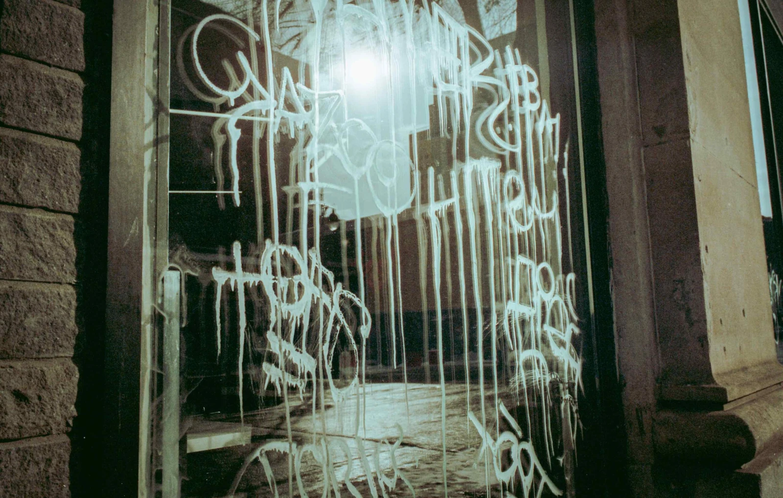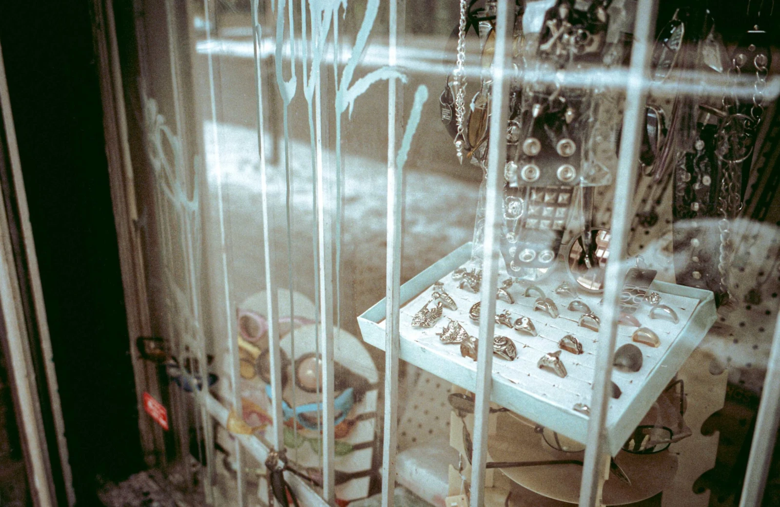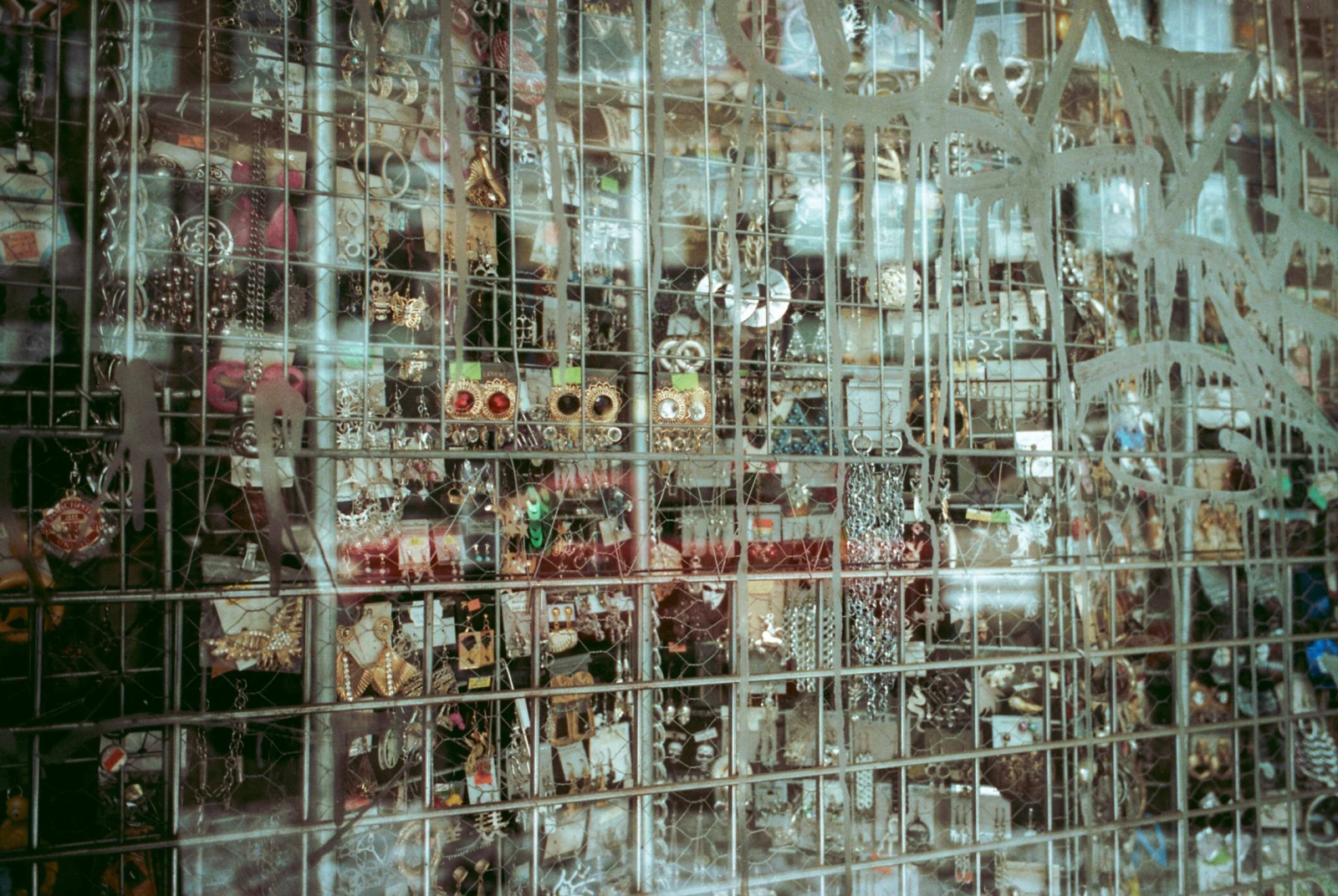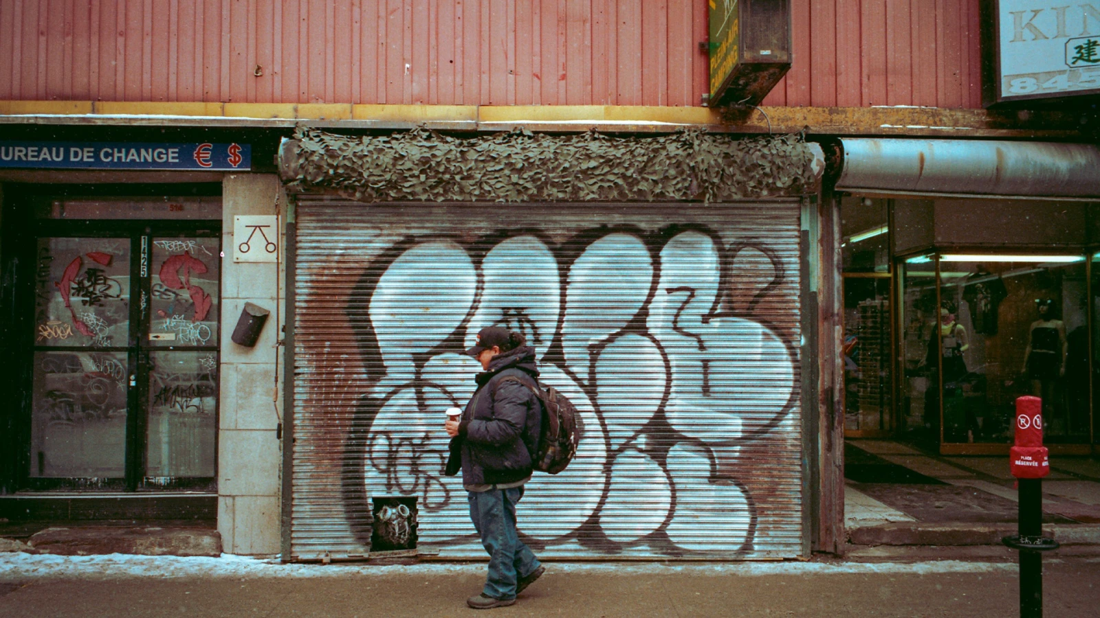 Là, des tags esquissés du bout des doigts sur la poussière des vitrines derrière les grilles de fer.