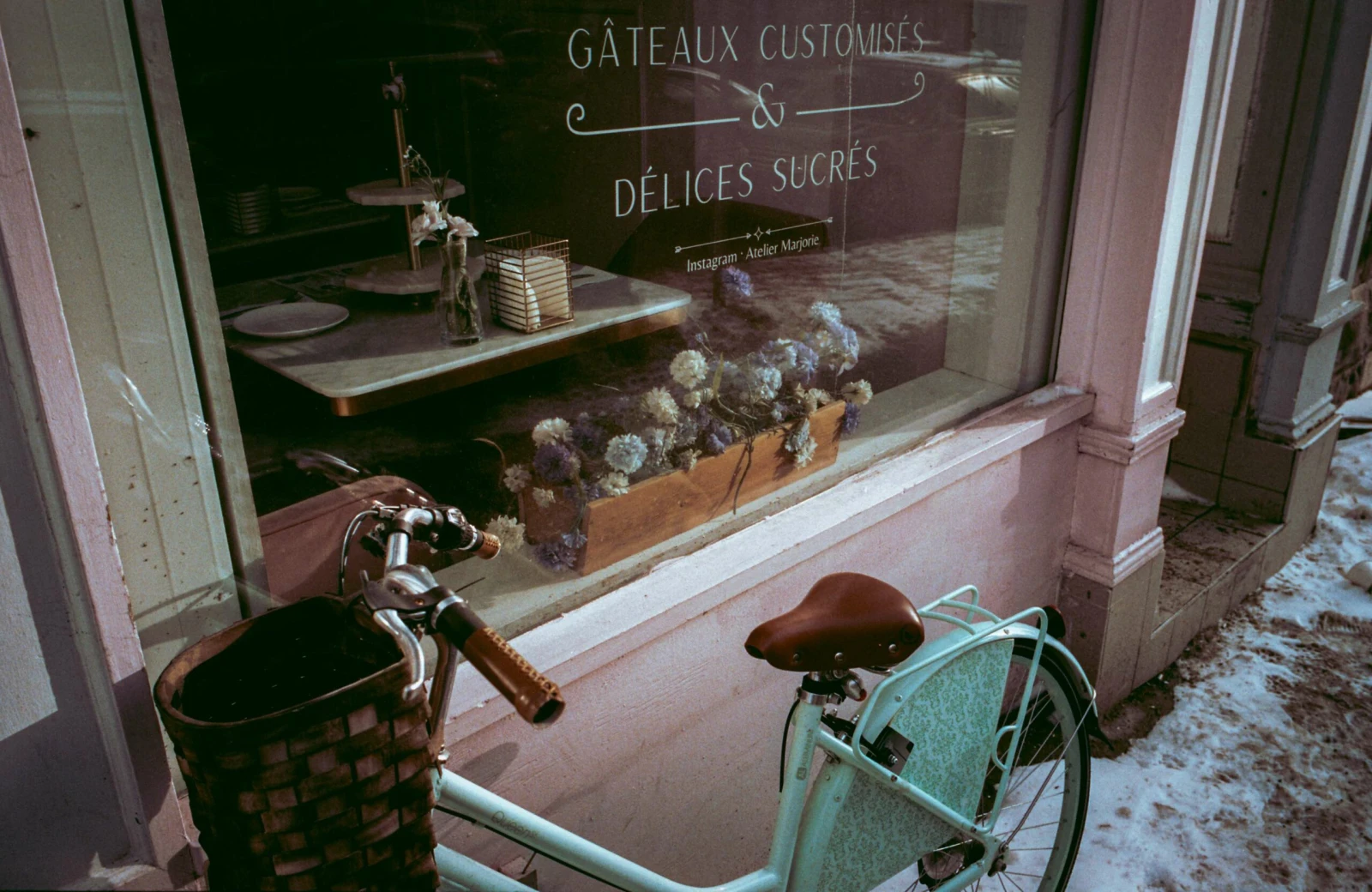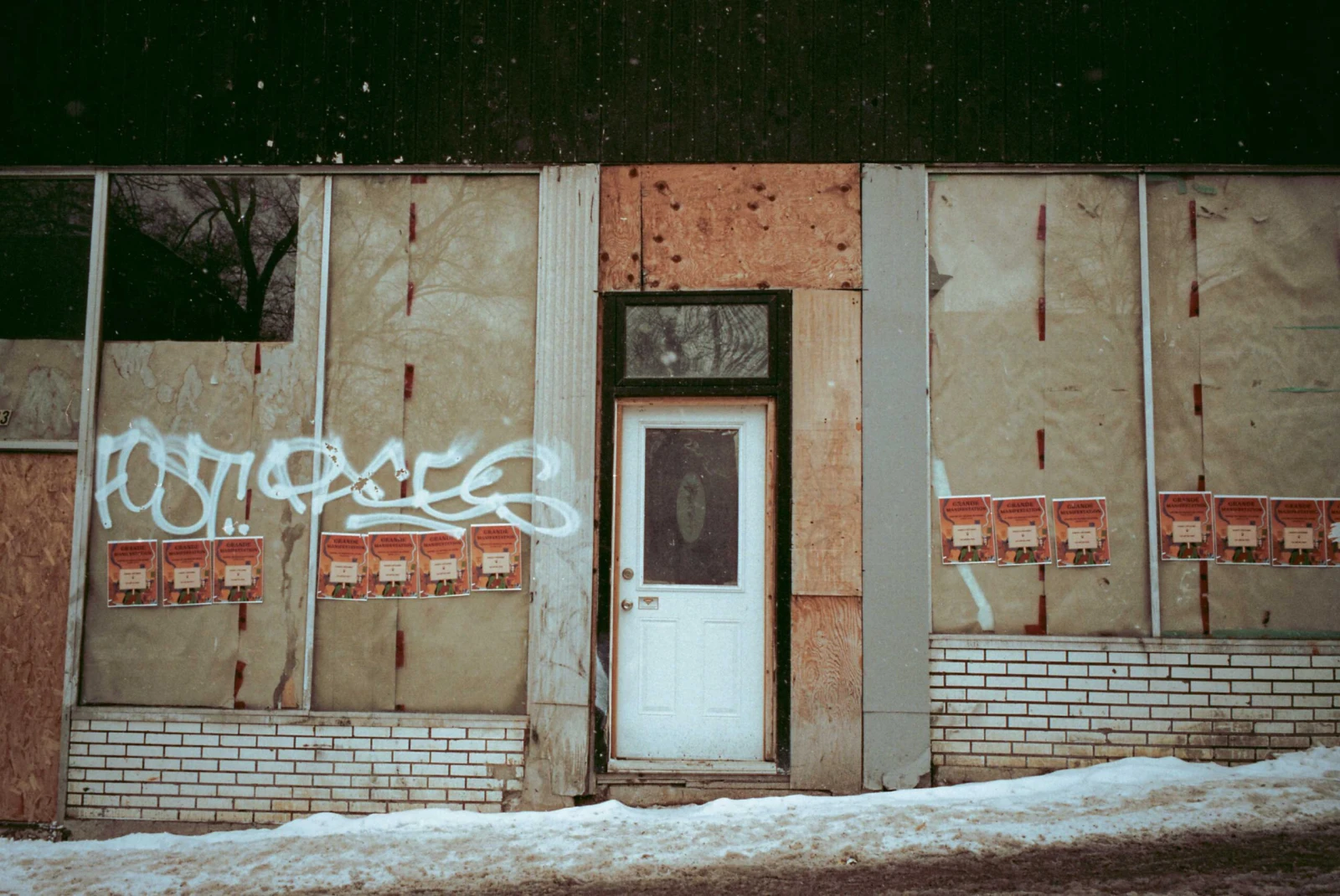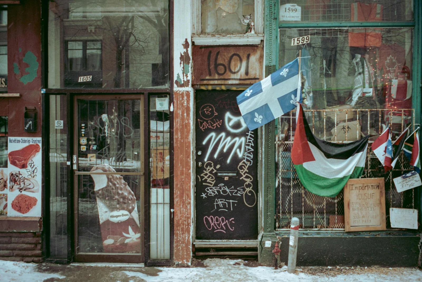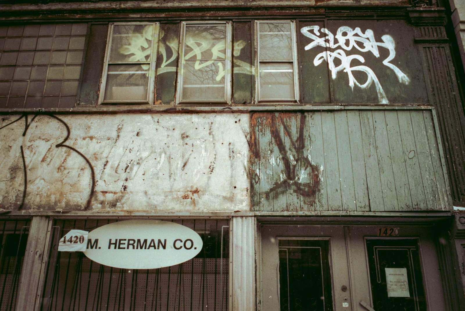 Là, des tags esquissés du bout des doigts sur la poussière des vitrines derrière les grilles de fer.