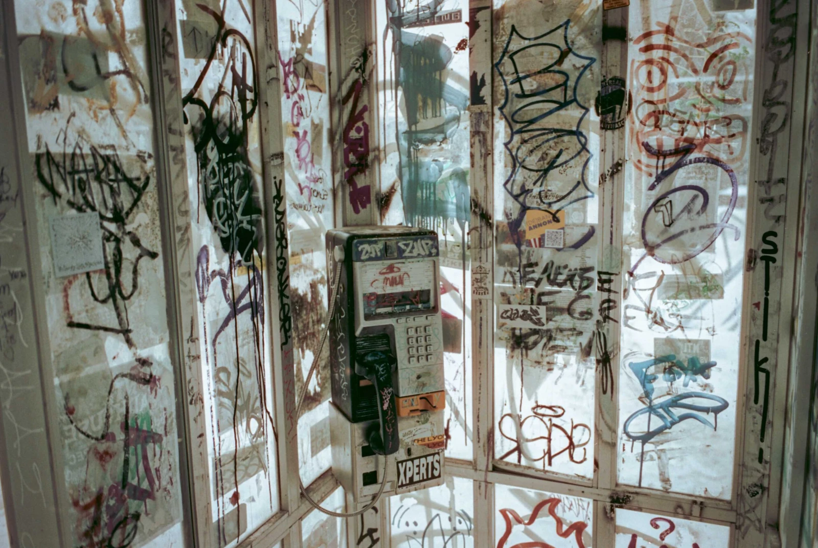 Sans fierté, une cabine téléphonique y sommeille telle une relique défigurée du passé.