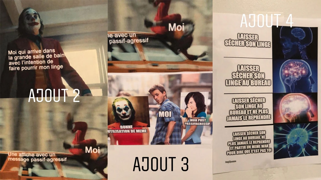Une autre preuve? Récemment, dans une des toilettes d’URBANIA, une guerre de memes a assailli un mur, après qu’une affiche au message passif-agressif y ait été laissée.