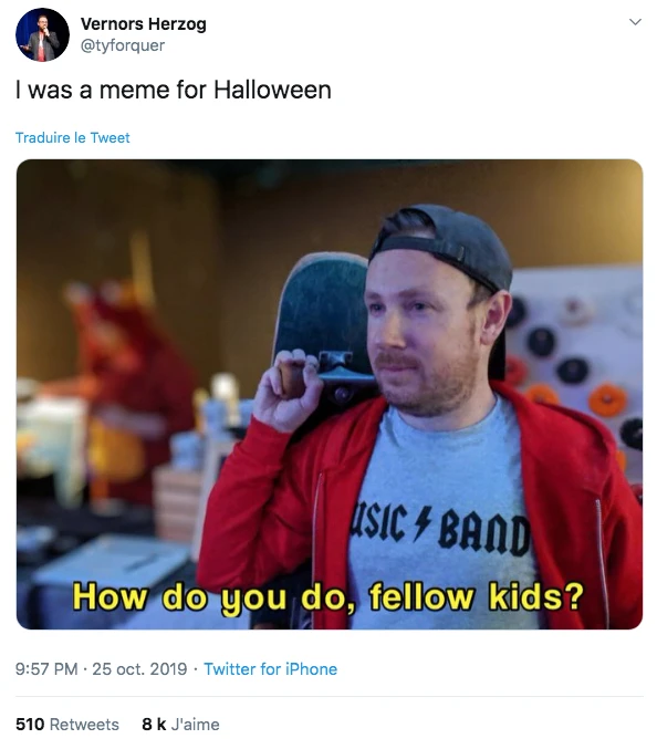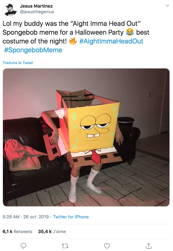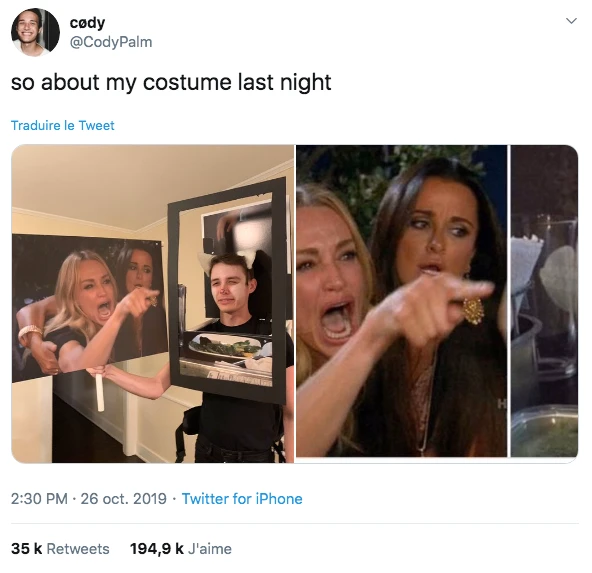 Ce meme qui date de 2018 est toujours assez populaire et circule pas mal. Comme il n’est pas tout frais sorti du four, un plus grand nombre de gens à votre party d’Halloween comprendront en quoi vous êtes déguisé(e).