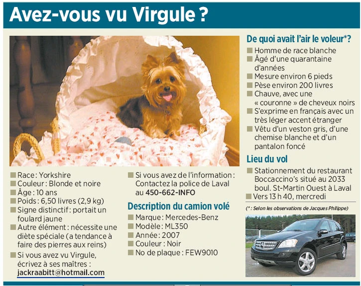 Historique? Un malfaiteur vole un camion Mercedes, qui vaut en effet une fortune, mais oh surprise, un chien s’y trouve. Panique dans les médias. RETROUVEZ VIRGULE! Récompense promise. Je ne veux pas être prophête de malheur mais Virgule a dû être vendu en pièces détachées.