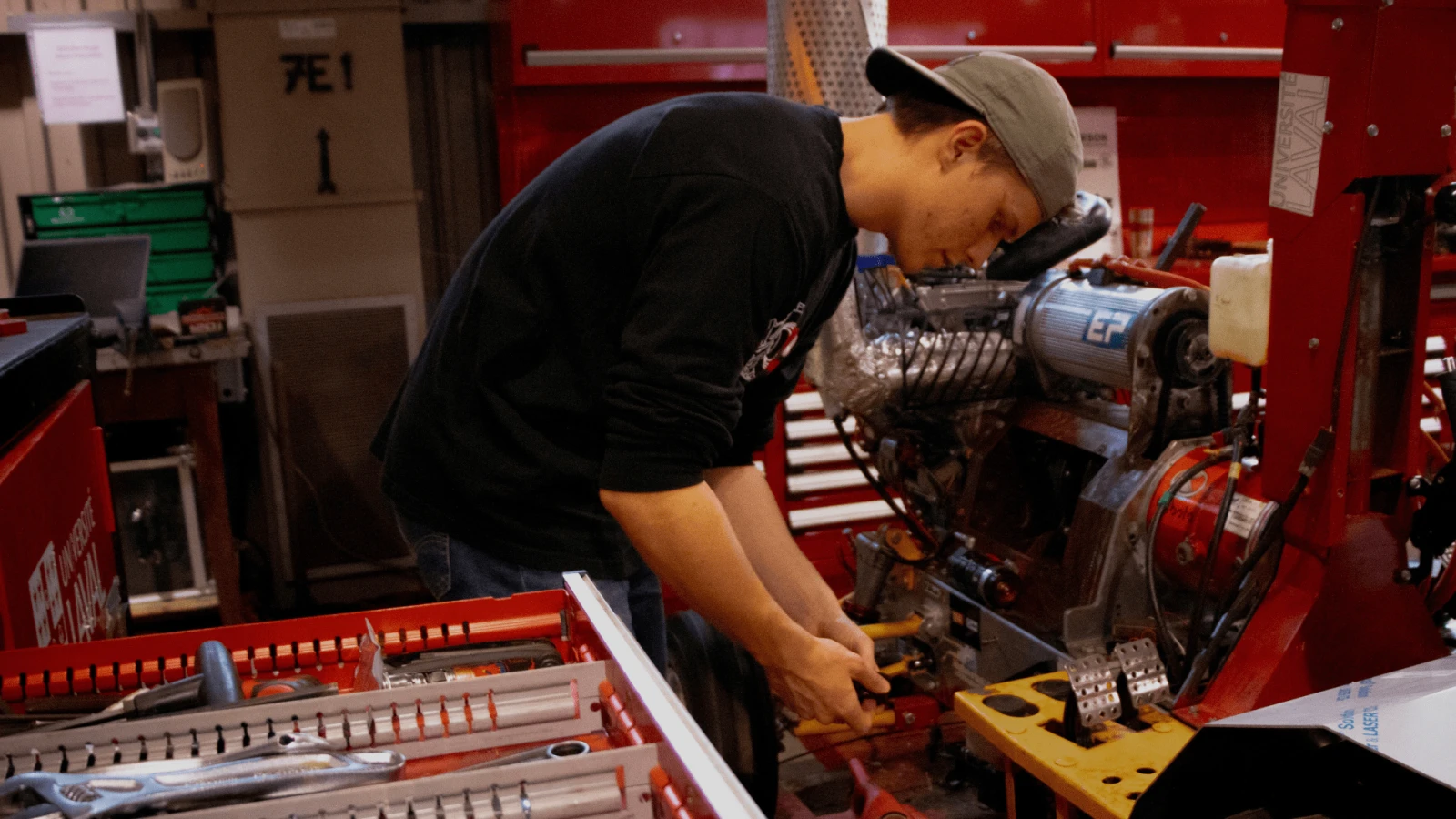 En plus, la compétition leur permet d’appliquer directement ce qu’ils voient sur les bancs d’école. « Dans les programmes d’ingénierie, souvent, c’est beaucoup plus des cours théoriques. Nous, on applique tout ça durant la période de design de notre tracteur. En plus, après, on peut les tester et voir si on a bien fait nos calculs, ou si notre tracteur va briser en deux », m’explique Alexis.
