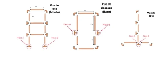 – Montez le jeu, selon le plan ci-dessous. Les pièces A et B sont les pièces qui raccordent l’échelle à la base.