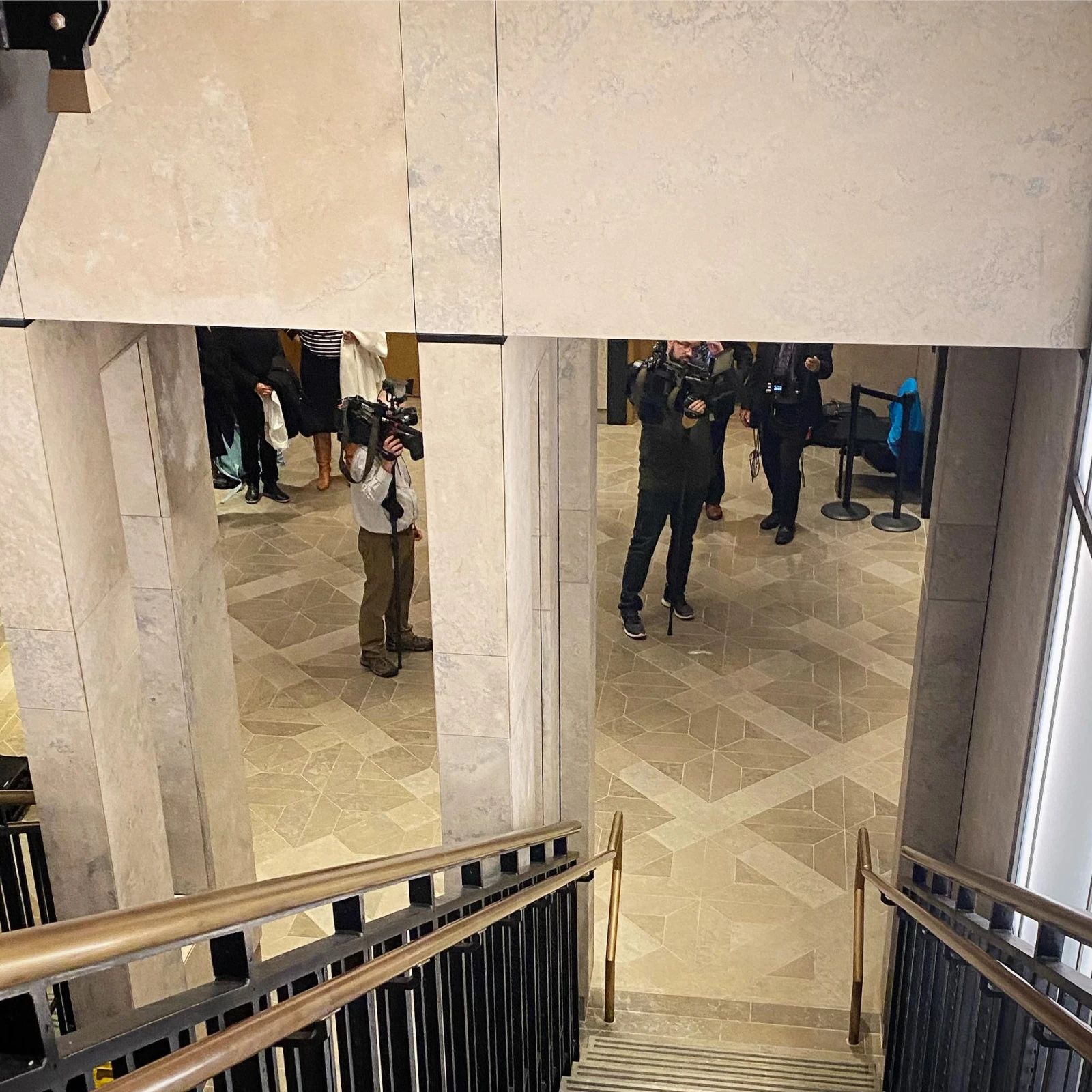 On me tend mon badge visiteur et Aly m’entraîne dans les dédales de couloirs : je ne pourrai jamais retrouver mon chemin seul au retour. La file devant l’ascenseur est compacte, on emprunte les escaliers jusqu’au quatrième, en passant devant des journalistes qui attendent de scrumer quelqu’un.