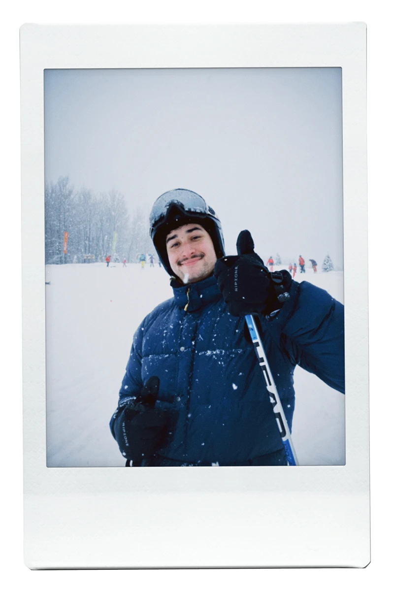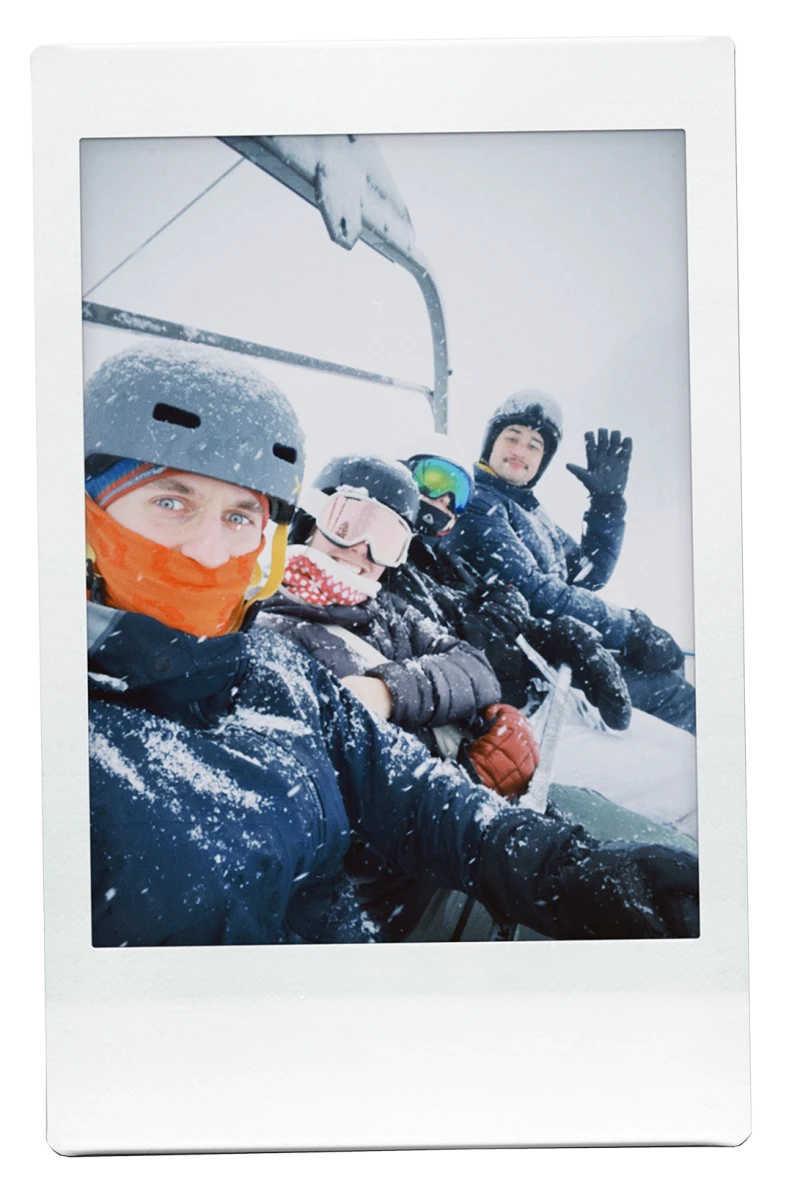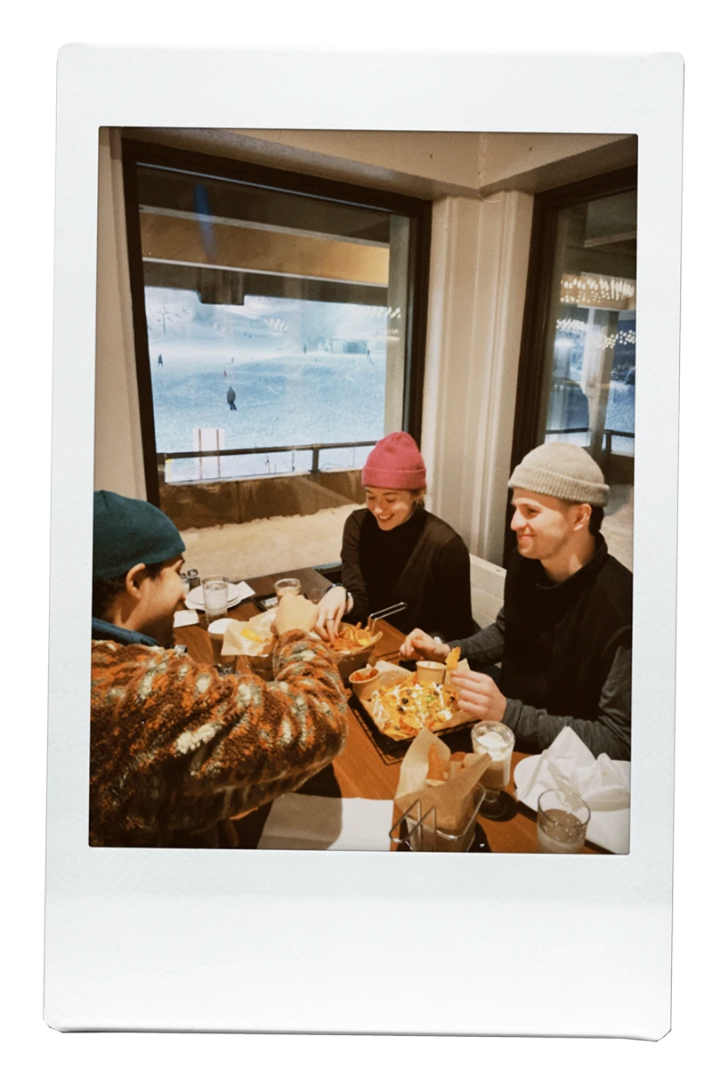 Avec une vue sur les pentes et les arbres enneigés, on trinque à la santé de Keenan, notre ami qui a ajouté une nouvelle corde à son arc! Fier, il nous annonce qu’il a déjà hâte à sa prochaine sortie de ski.