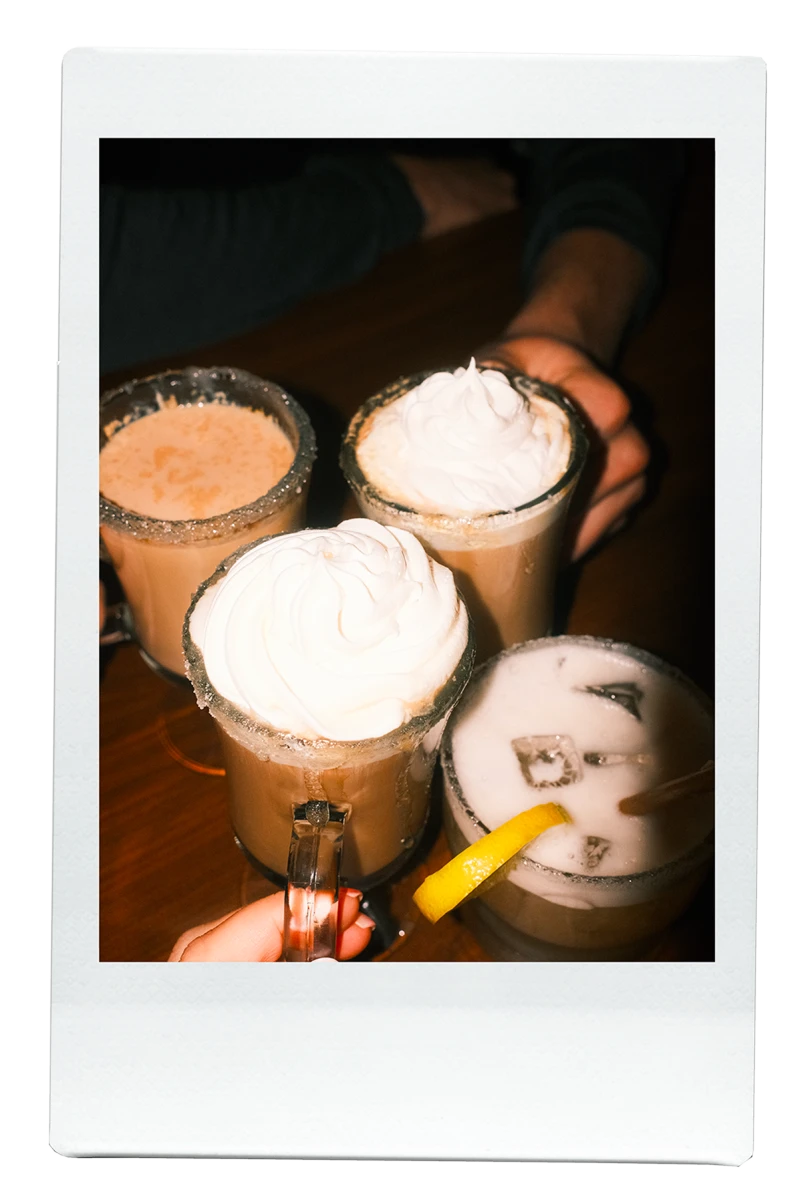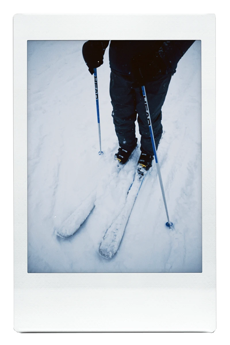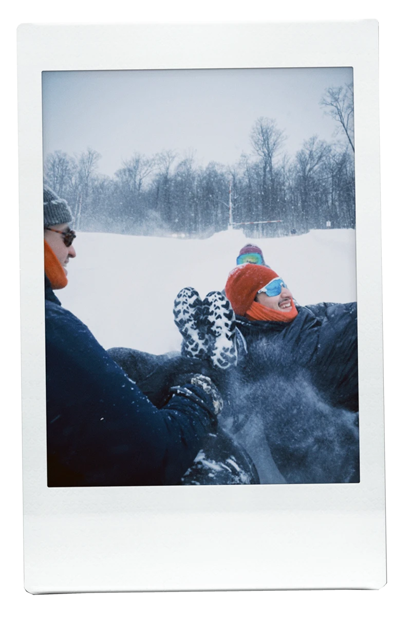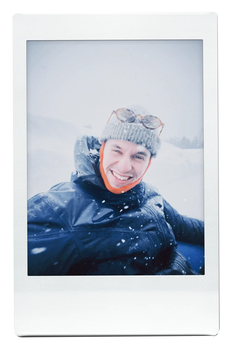 Avec une vue sur les pentes et les arbres enneigés, on trinque à la santé de Keenan, notre ami qui a ajouté une nouvelle corde à son arc! Fier, il nous annonce qu’il a déjà hâte à sa prochaine sortie de ski.