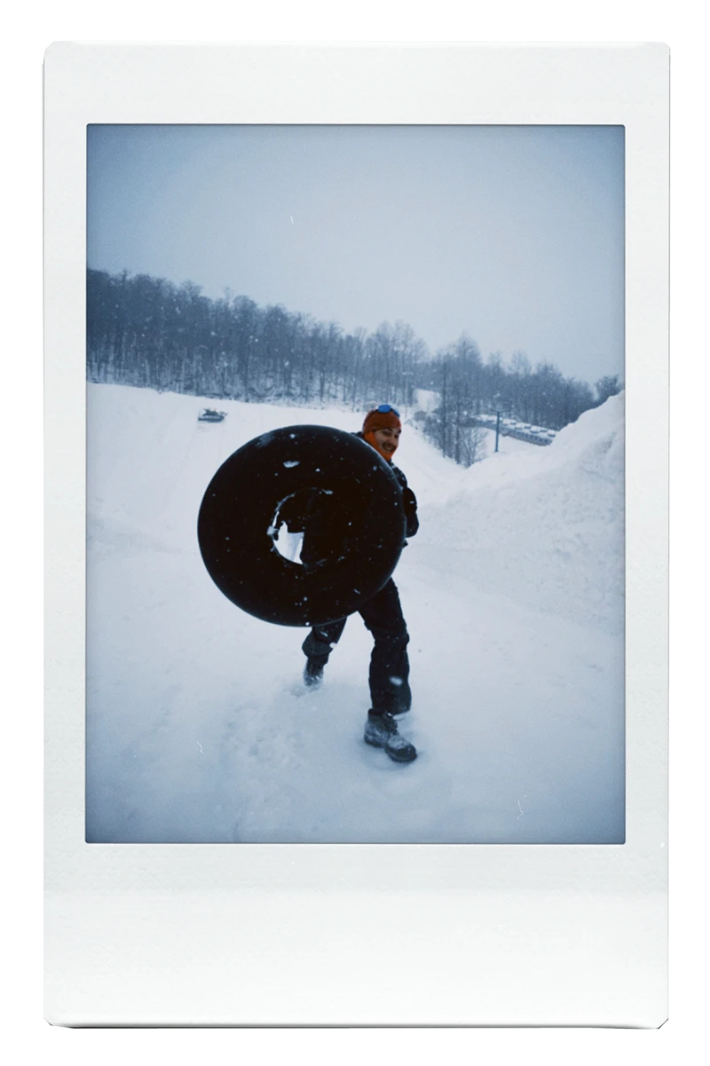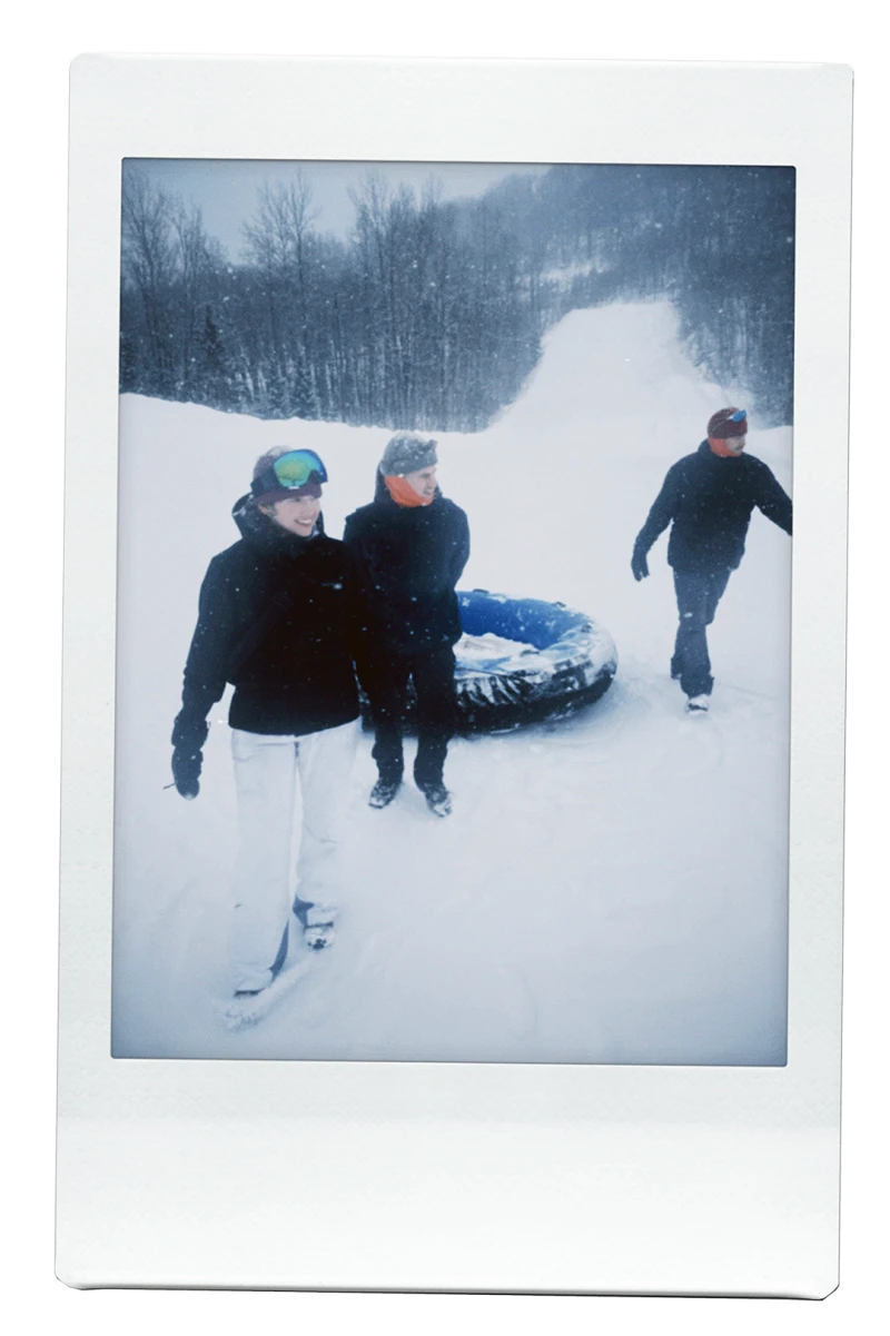 L’activité hivernale qui nous attend aujourd’hui : les Glissades sur tube du Sommet Saint-Sauveur, versant Avila. Un long tapis roulant recouvert d’un toit nous permet d’atteindre le sommet. Les employé.e.s nous aident à attacher nos tubes ensemble avant de nous donner une grande poussée.