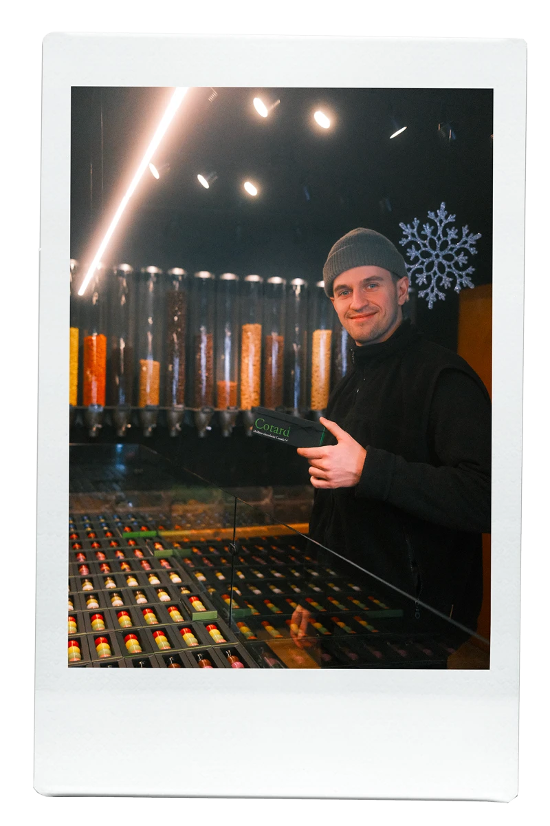 Dans le même édifice, on remarque l’élégante chocolaterie Cotard Chocolatier et on décide d’y faire un tour (de vraies bibittes à sucre). Étant moi-même une professionnelle du chocolat, je peux vous l’affirmer et vous pouvez me faire confiance : ce chocolat est divin.