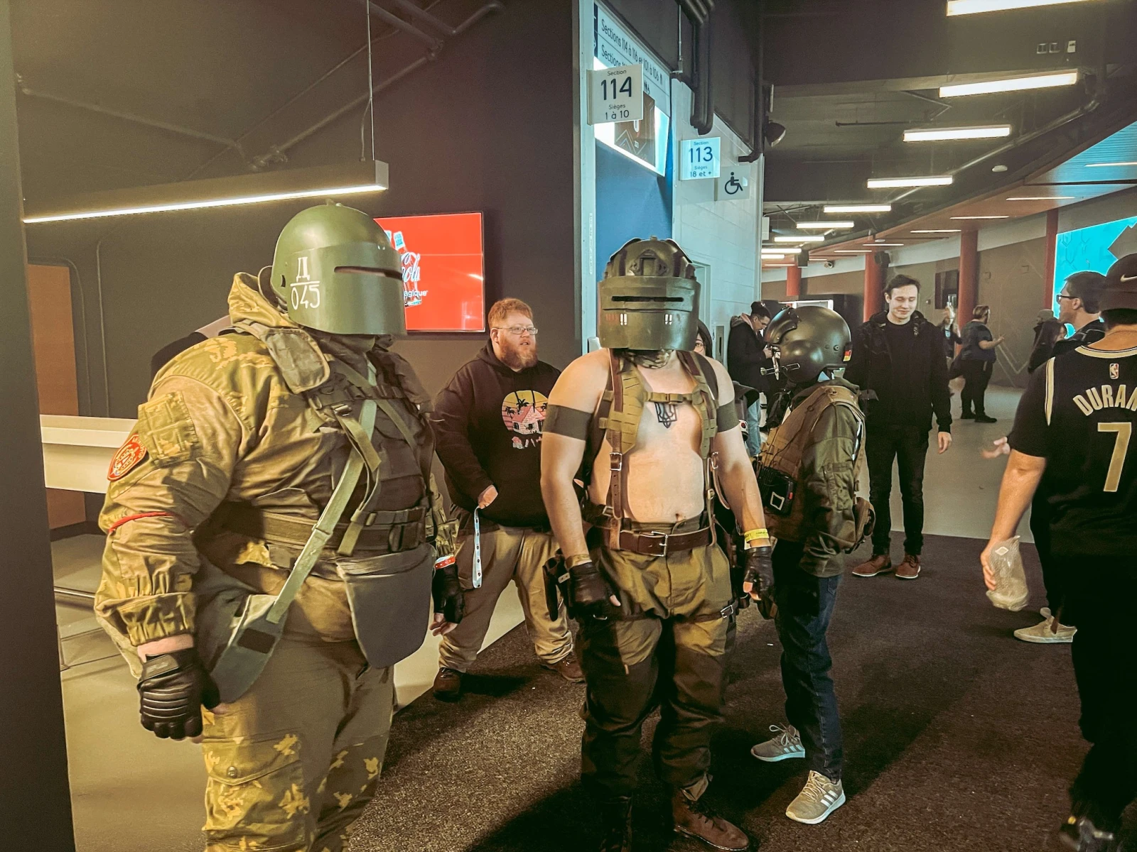 Dès mon entrée dans ce Colisée des temps modernes, un univers parallèle s’ouvre à moi : un joueur taïwanais à peine pubère signe le casque de combat d’un vieil homme avec une barbe tressée bleue. Un furry échappe de la moutarde sur sa fourrure. Un trio costumé en SWAT demande un selfie à un fluet combattant à lunettes alors que des commandos de partisans drapés de leurs patries défilent avec des affiches humoristiques.