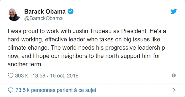 Mais dans le dernier droit, Justin a reçu un appui de taille, celui de l’ex-président Barack Obama (non, contrairement aux idées reçues, ça ne fait pas une éternité que Trump est président).