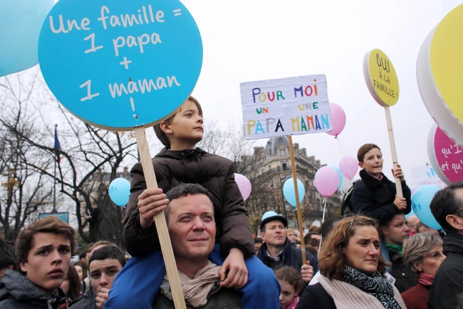 En cette ère supposément moderne, certaines personnes prétendent toujours que le père et la mère hétérosexuels détiennent le monopole pour égayer ou gâcher, si on en croit le bonhomme sur cette photo qui ose mêler sa progéniture à sa campagne fielleuse, la jeunesse d’un bambin. «Notre objectif, c’est de mener une véritable bataille pour la sauvegarde de la famille et de l’enfant», a notamment déclaré Alain Escada, responsable de Civitas et militant d’extrême-droite.