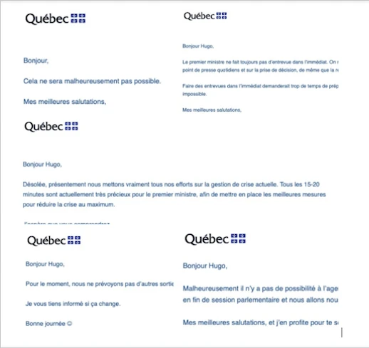 Depuis mars dernier, j’ai sollicité à plusieurs reprises une entrevue avec le premier ministre François Legault. Après avoir offert depuis le début de la crise une tribune à plusieurs personnalités politiques telles que Valérie Plante, Mélanie Joly, Gaétan Barrette et Jean-François Roberge, on se disait que ça serait pertinent de permettre au chef de la CAQ de s’adresser à notre communauté.